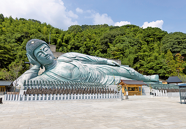 篠栗四国霊場の総本寺、第一番札所の南蔵院。穏やかなまなざしで人々を見守る釈迦涅槃(しゃかねはん)像が今年建立30周年を迎えました。ブロンズ製では世界最大級(全長41m、高さ11m、重さ約300t)を誇る涅槃像前で記念法要が営まれます。午前10時半からは和太鼓OTO.GATARIによる奉納演奏で節目となる法要の日を華やかに飾ります。