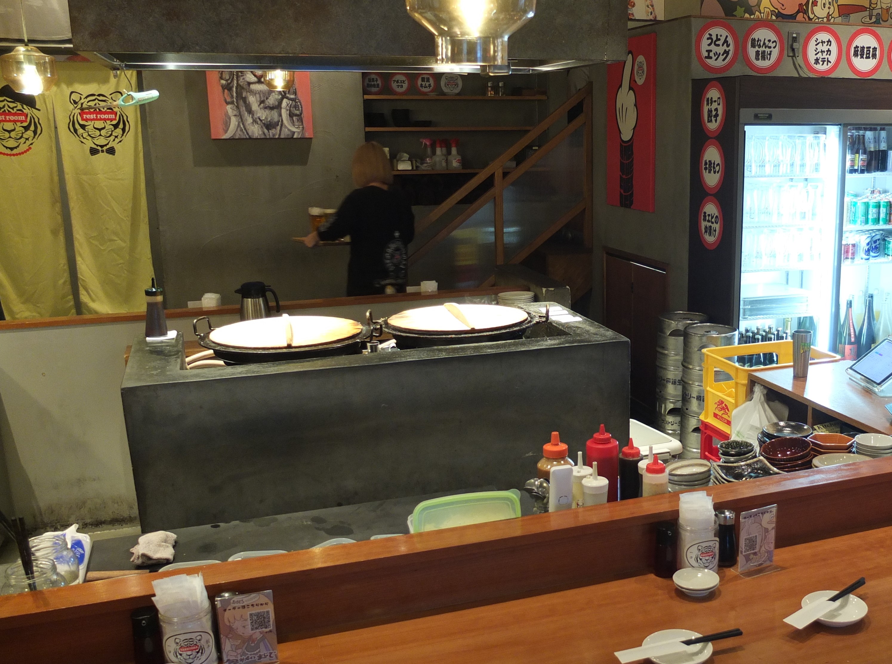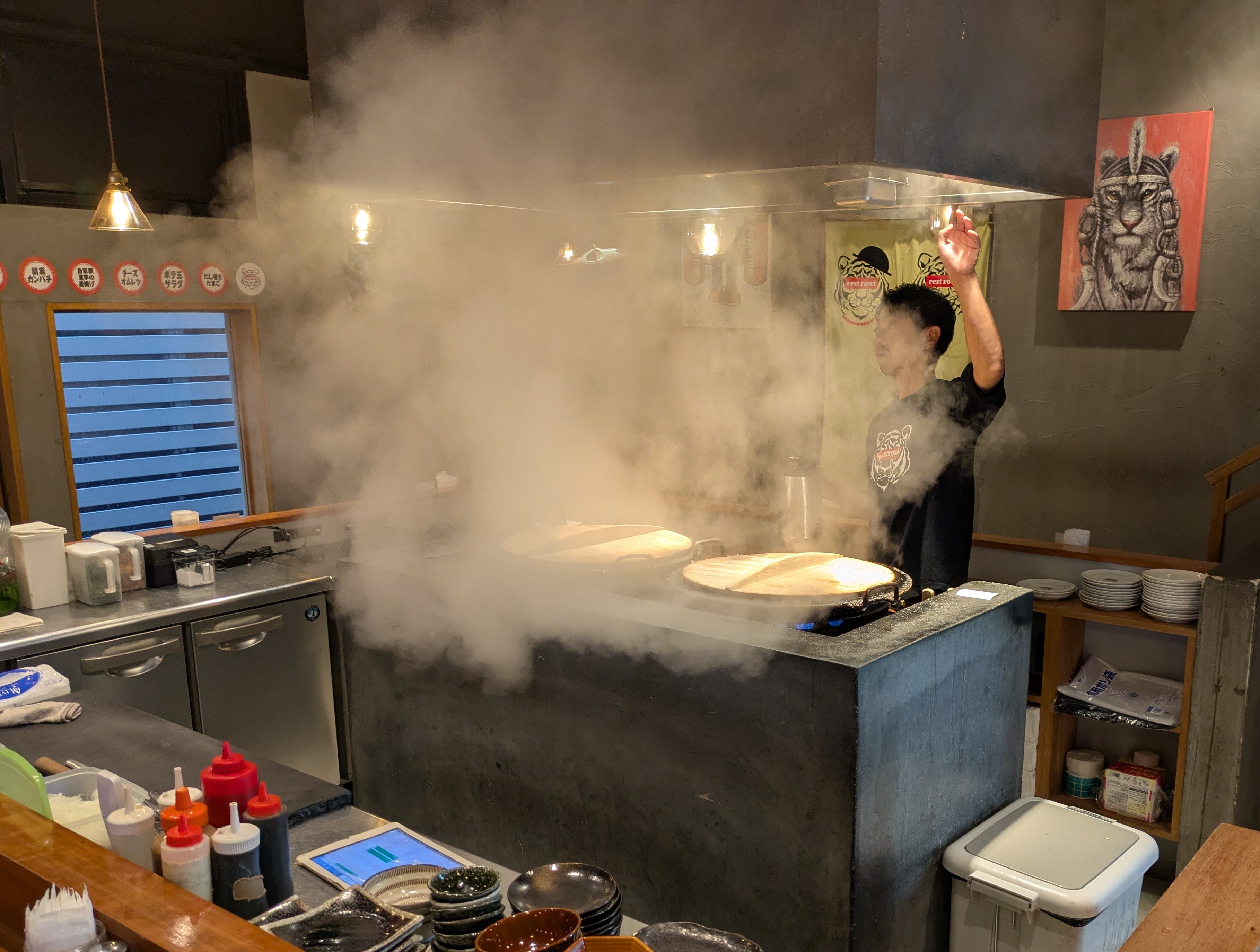 注文は卓上に置かれた2次元コードをスマホで読み取るモバイルオーダー方式。オーダーが入ると店長の小野雄大さんが鉄鍋に手際よく餃子を並べて焼き始めます。