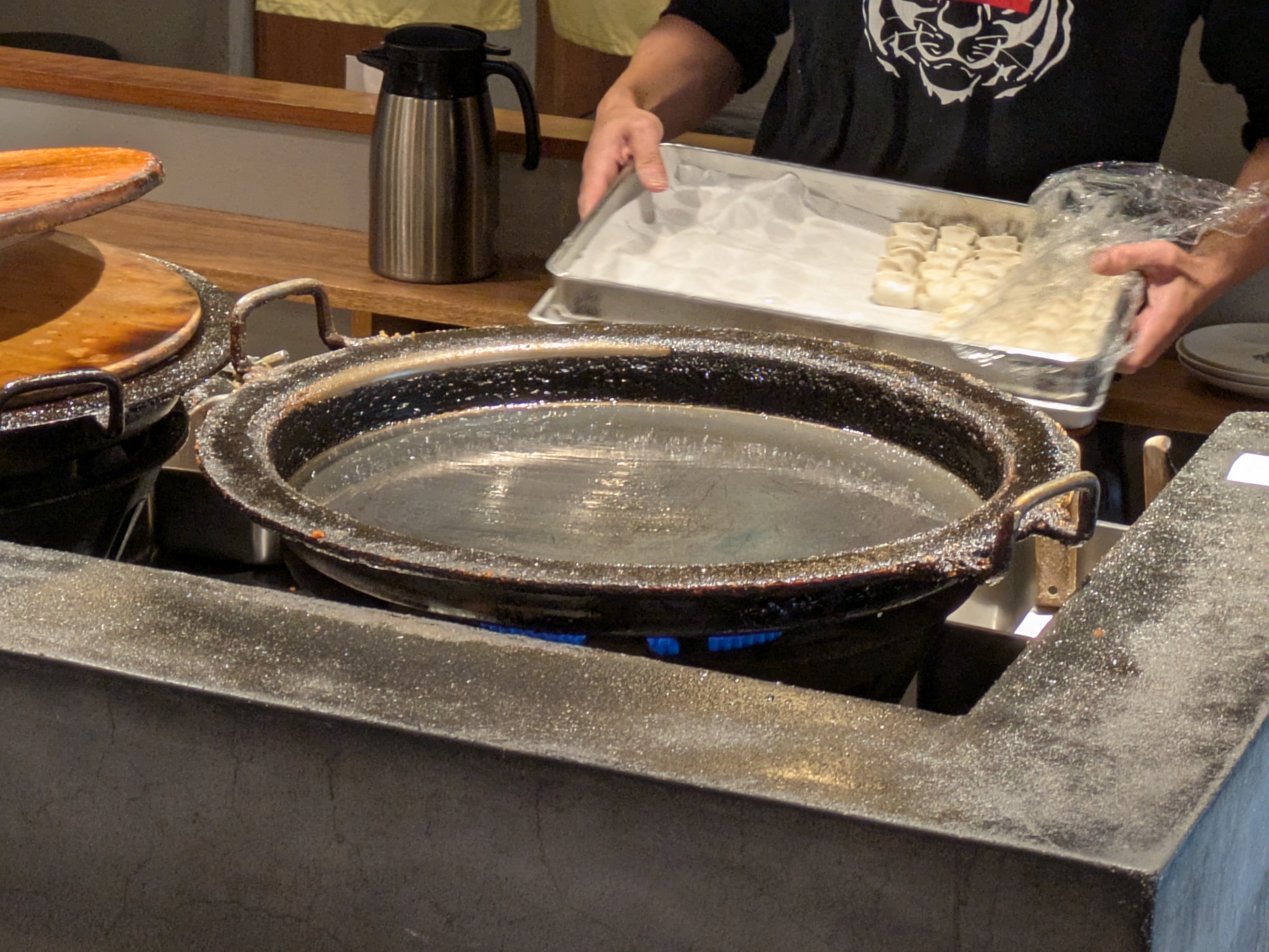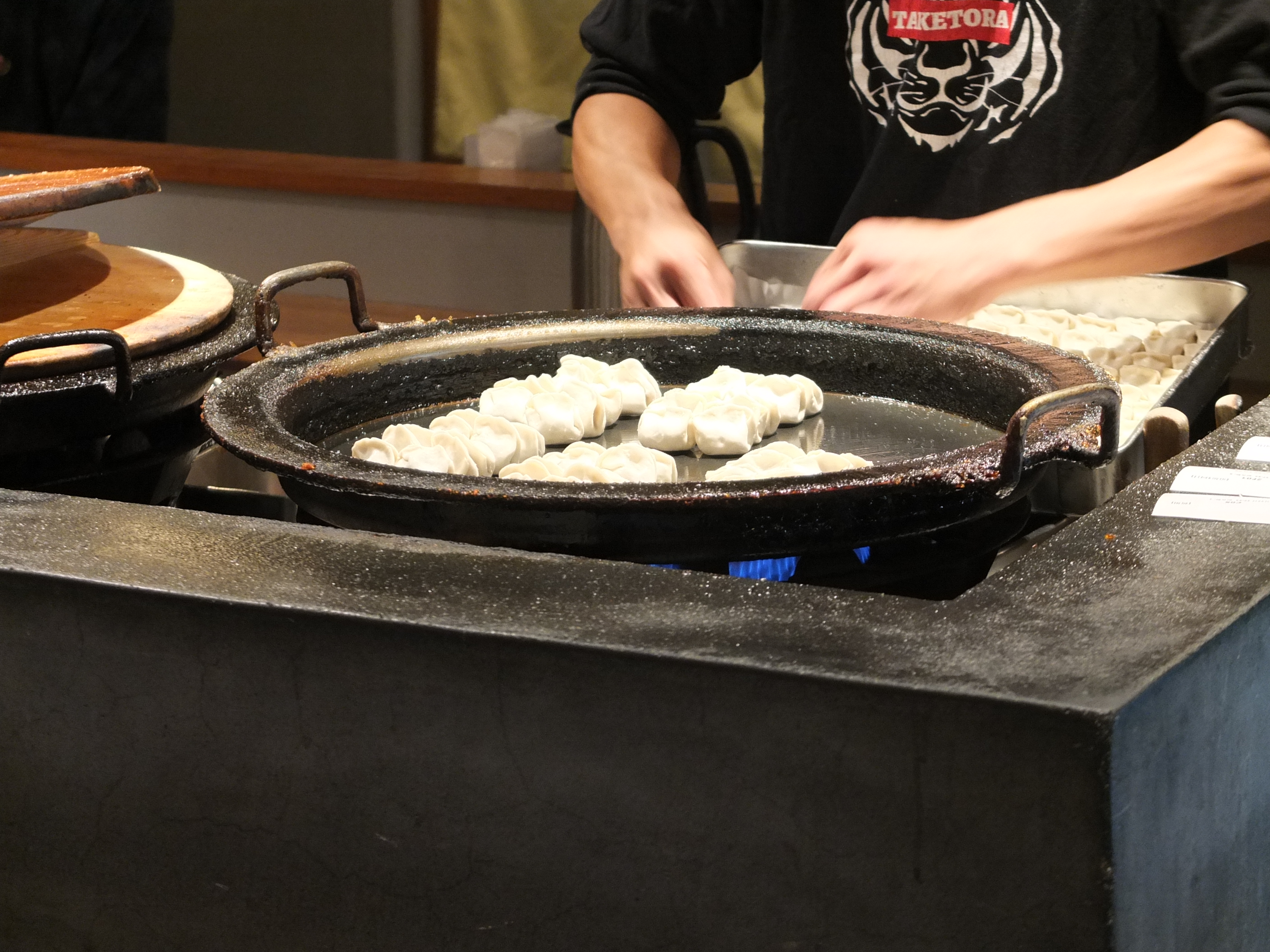 巨大鉄鍋で焼く大人気の博多一口餃子