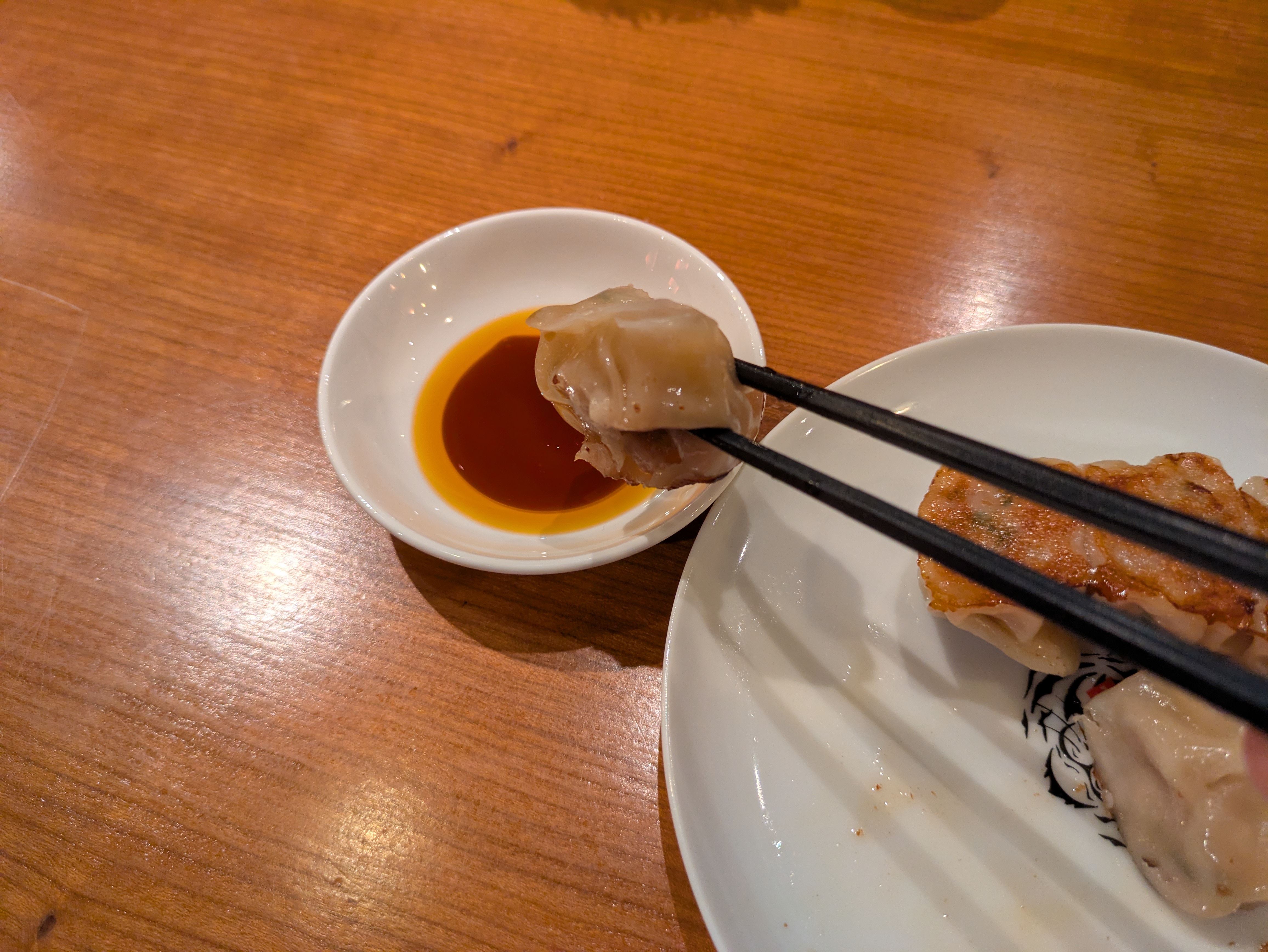 まずはそのまま一つ目をパクリ!熱々の餃子は、焼き目がついた皮がカリッとしていて、かむと肉のうま味とニンニクの香りが広がります。