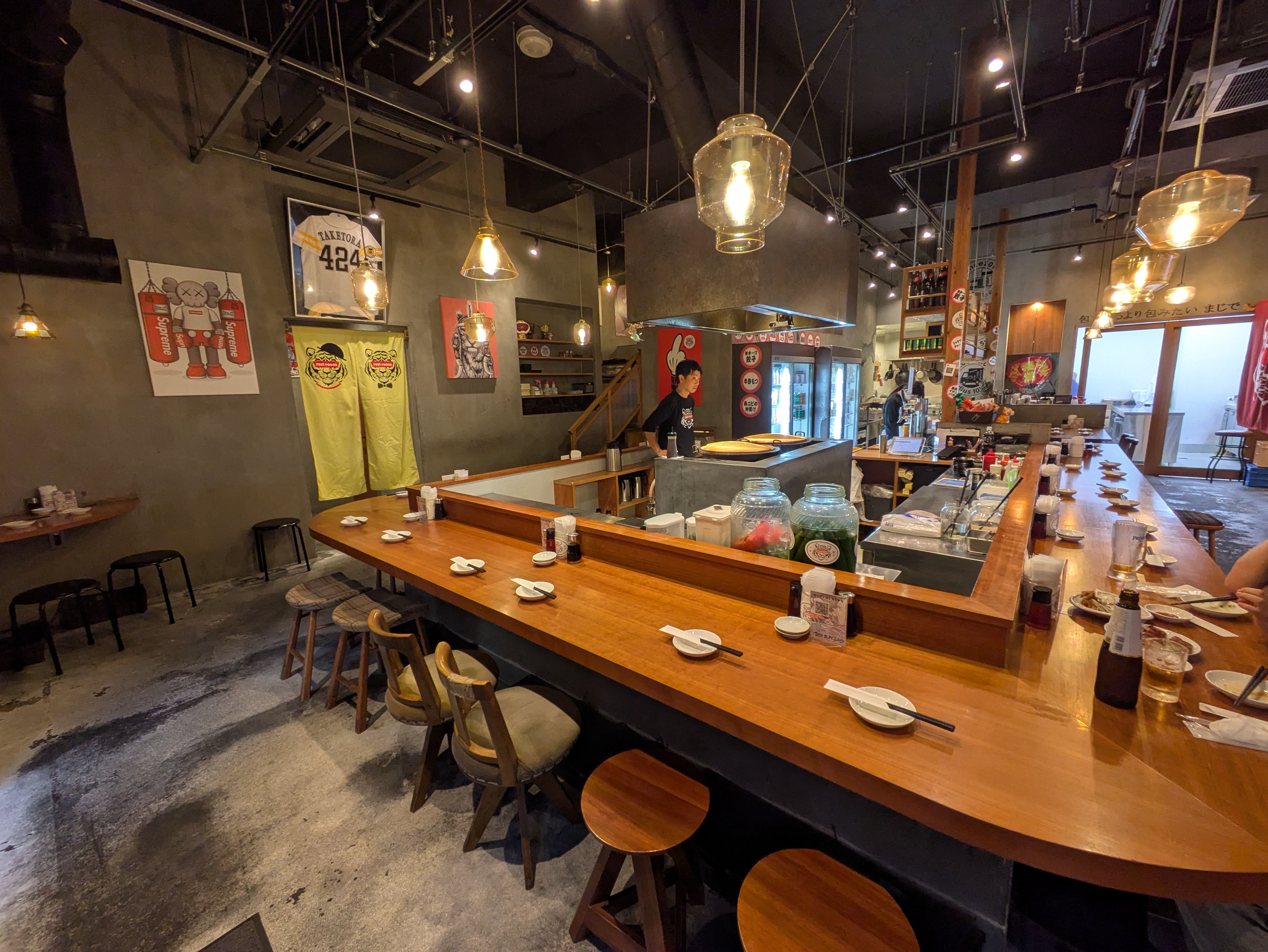 1階はオープンキッチンを囲むカウンター席がメイン。目の前で料理が出来上がる様子を楽しめます。テラスと中2階がテーブル席になっています。メニューは刺し身や自家製チャーシュー、激辛麻婆豆腐など60種類超と豊富。