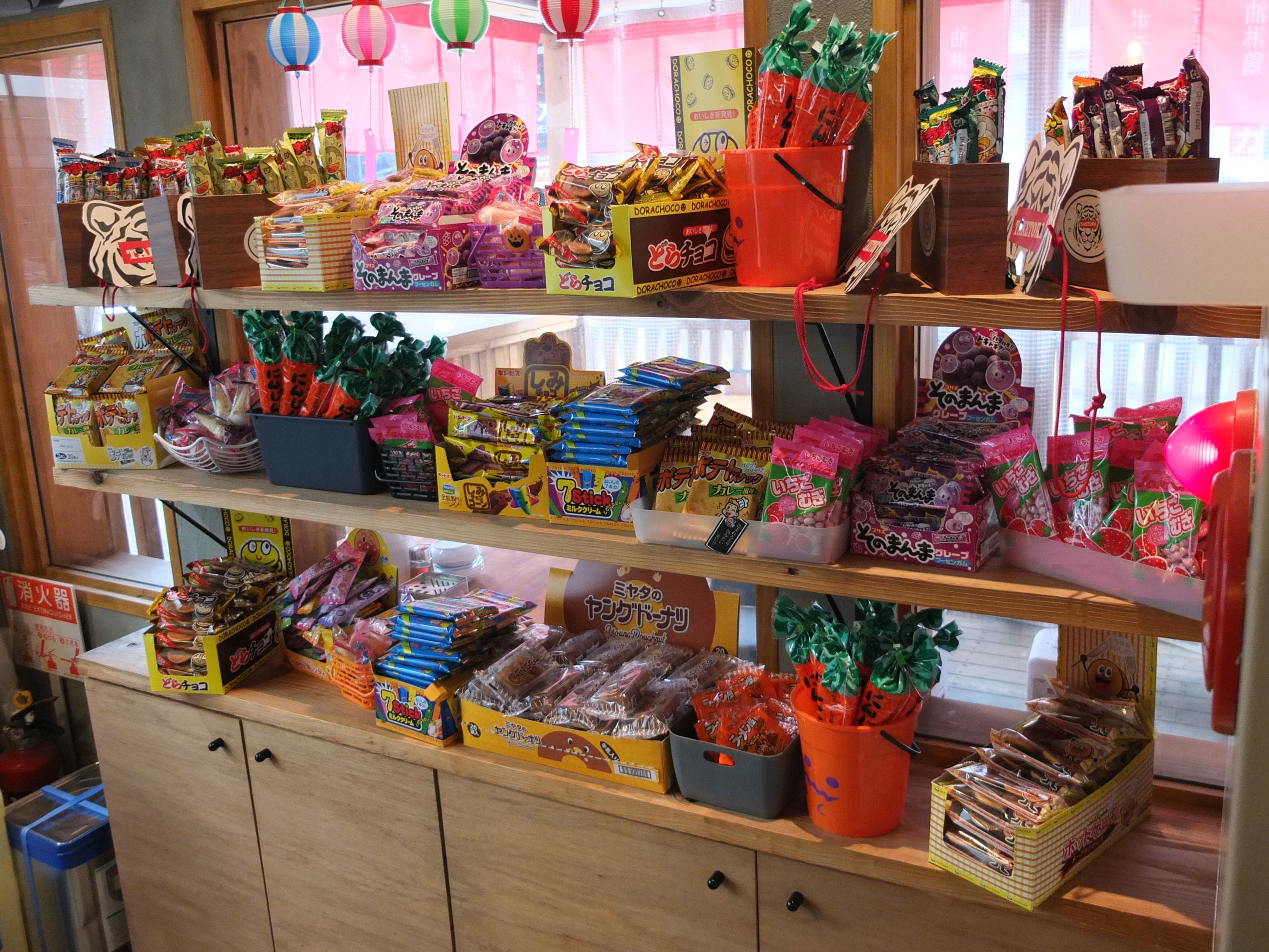 店内には駄菓子コーナーも。1回300円で30秒間駄菓子の詰め放題ができます。