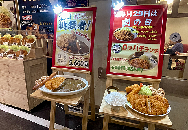 前者はご飯2kg、カレールー1kg。後者はとんかつやエビフライ、唐揚げ、コロッケに加え、ご飯が無料で700gまで増量できます。
