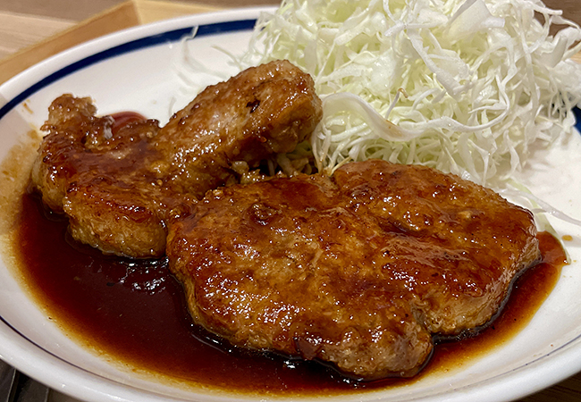 とんかつや鶏かつ、カレーなど数あるメニューで圧倒的に人気なのが「とんてき」。基本の「満腹とんてき定食」(1,120円)は、肉180gに山盛りのキャベツサラダ、ご飯は200g、300g、400gから選べます。