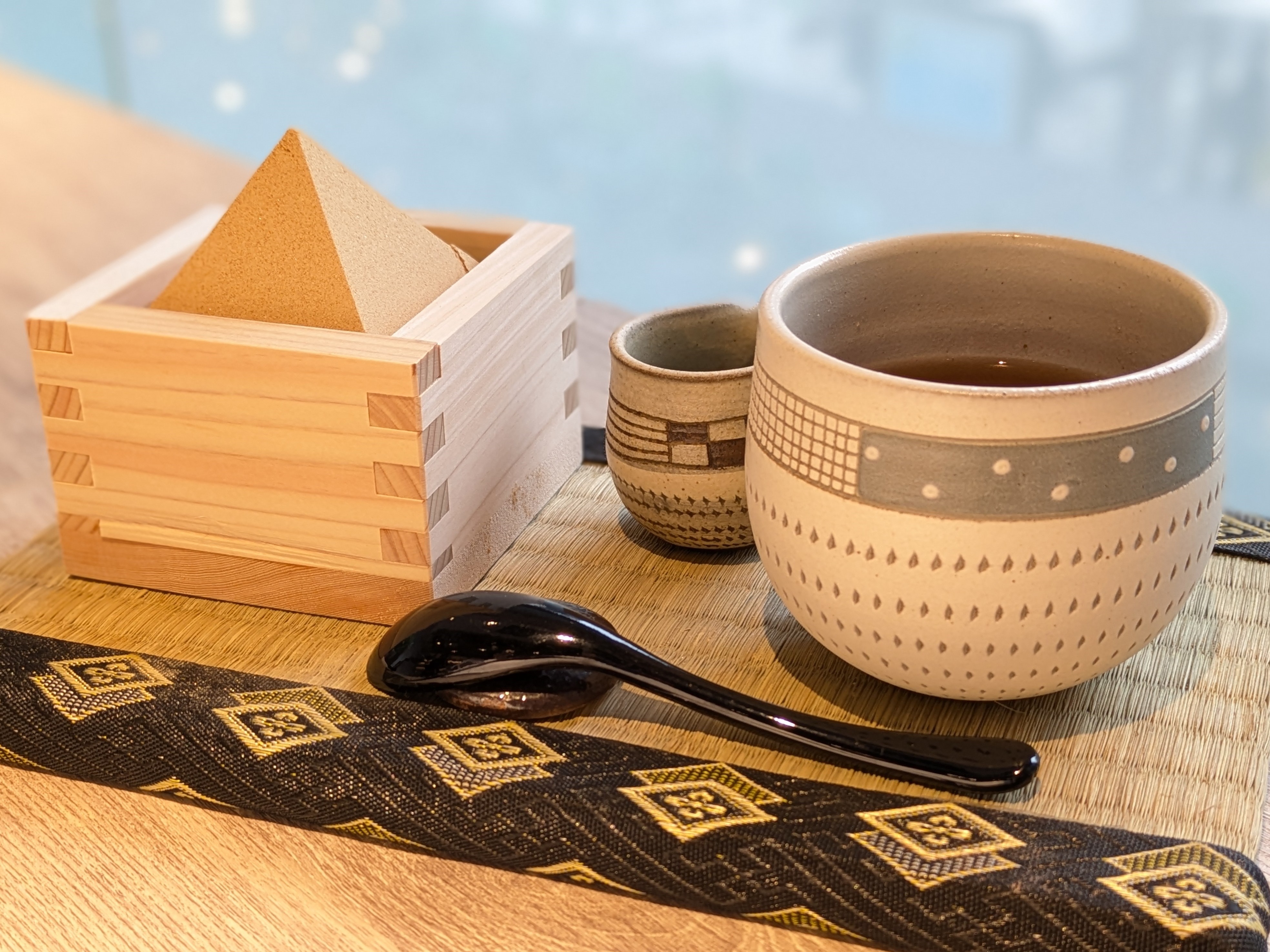 さらさらときめ細やかな粒子のきな粉は、木升からマットやテーブルにこぼれる前提で大胆にどうぞ。でもやっぱりこぼしたくない、という人のためにメニュー開発者直伝の食べ方をこっそり伝授。