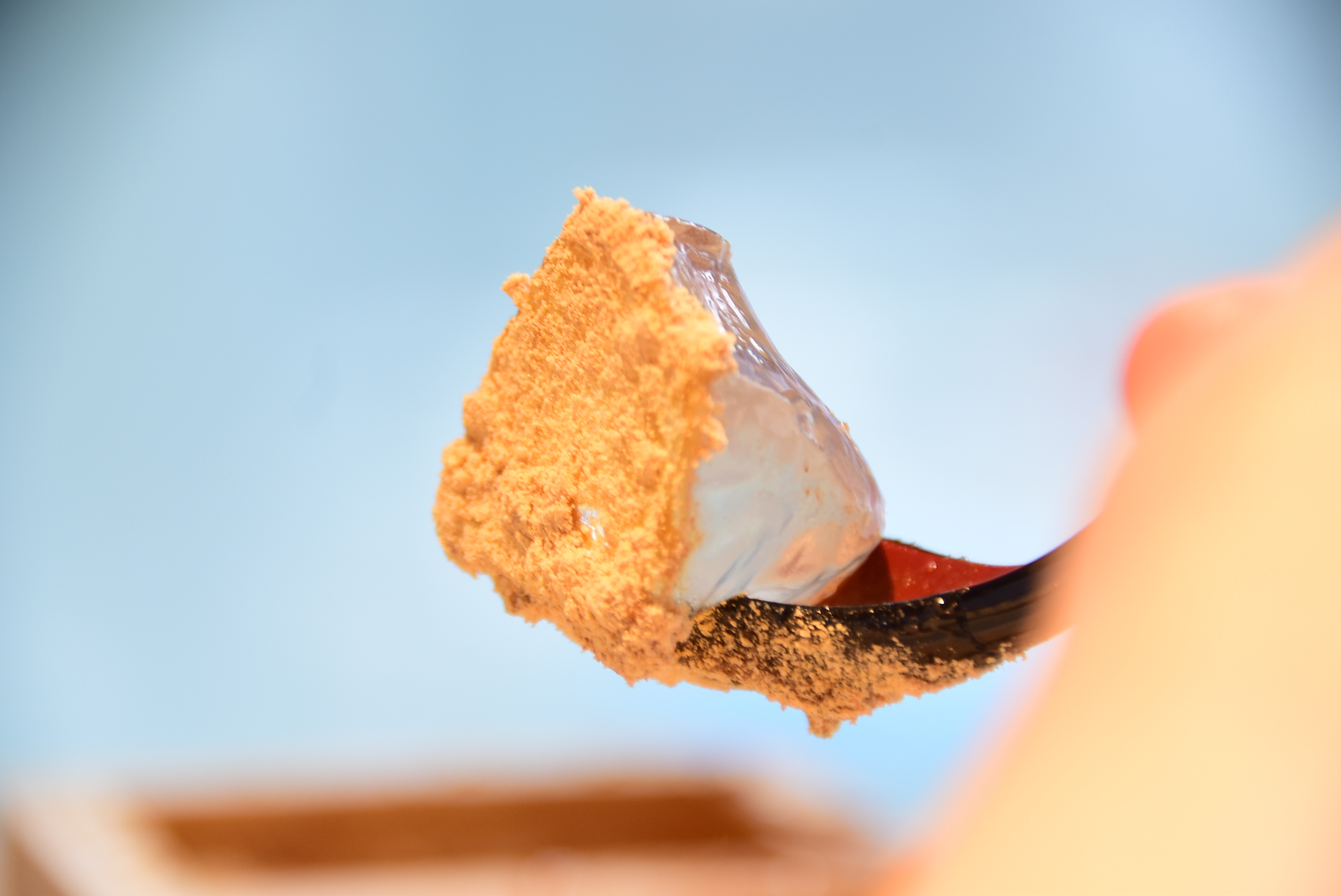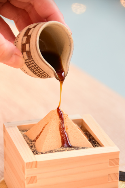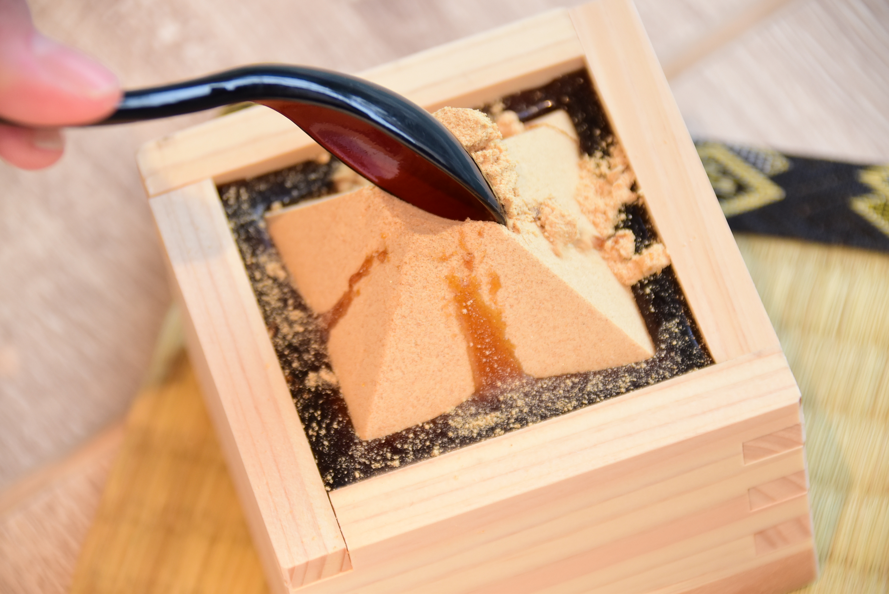 きな粉ピラミッドをスプーンの背でそっとつぶしながら、木升の一角から雫もちをすくって空間を作ります。そこにきな粉を流し込みながら混ぜて食べていくと「2回に1回くらいはこぼさず成功します(笑)」とのこと。ゲーム感覚で食べていく様子もSNS映え間違いなし…かもしれませんね。