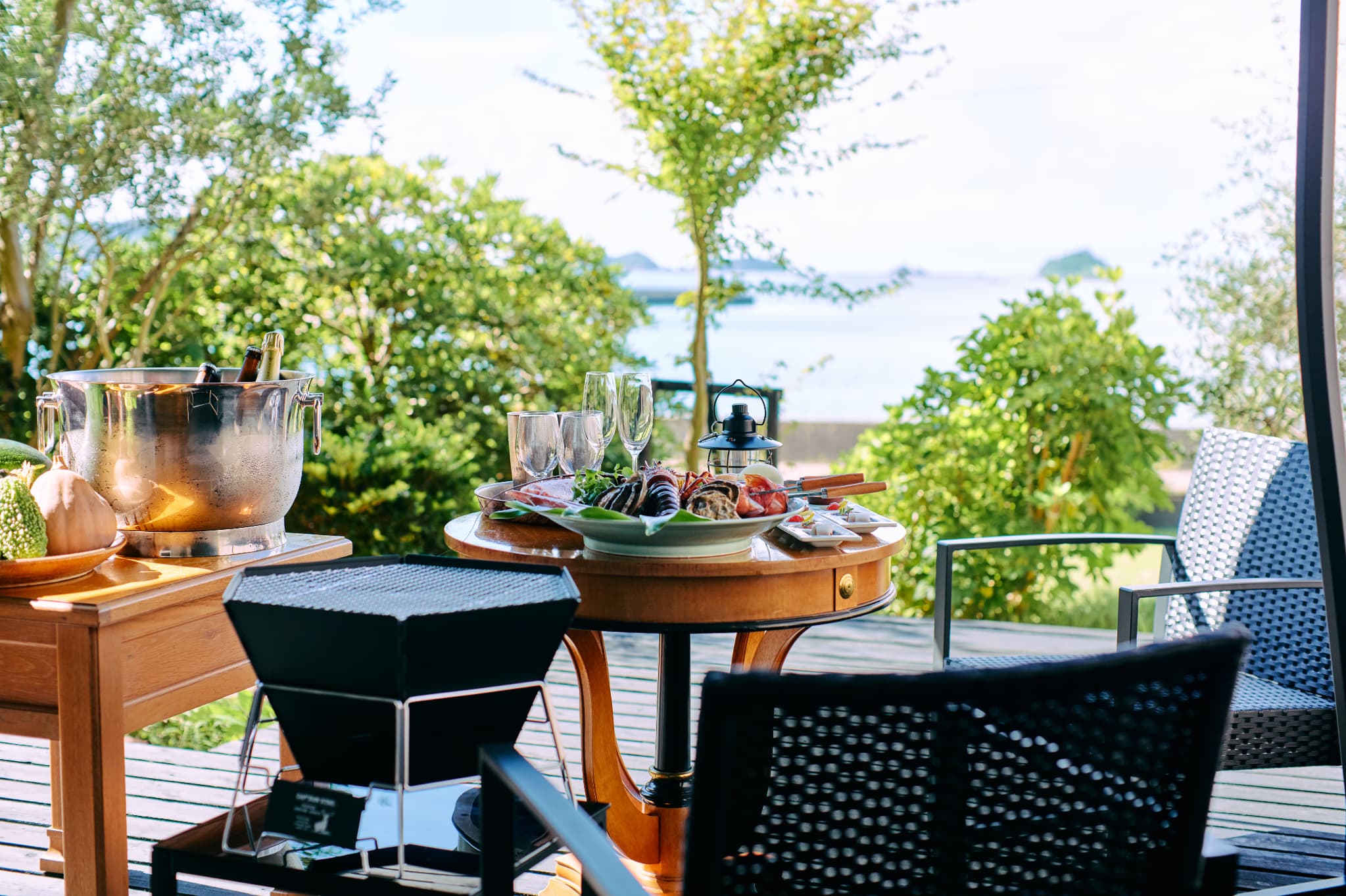 火入れや仕上げはすべてスタッフが担当するため、ゲストはゆったりと景色と料理を楽しむことができます。雨天・荒天時には、館内レストランにてアップグレードされた会席コースが用意されるのも安心です。