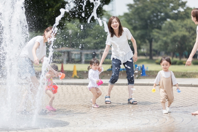 子どもたちは大きな公園の水遊び場に大興奮の様子でした。