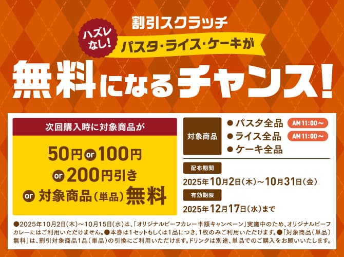 同日より、店舗での会計1回につき、対象商品が最大で無料になるスクラッチカードを1枚プレゼント。割引は50円、100円、200円、無料のいずれかが当たります。対象商品はパスタ・ライス・ケーキメニューの一部で、次回購入時に利用可能です。