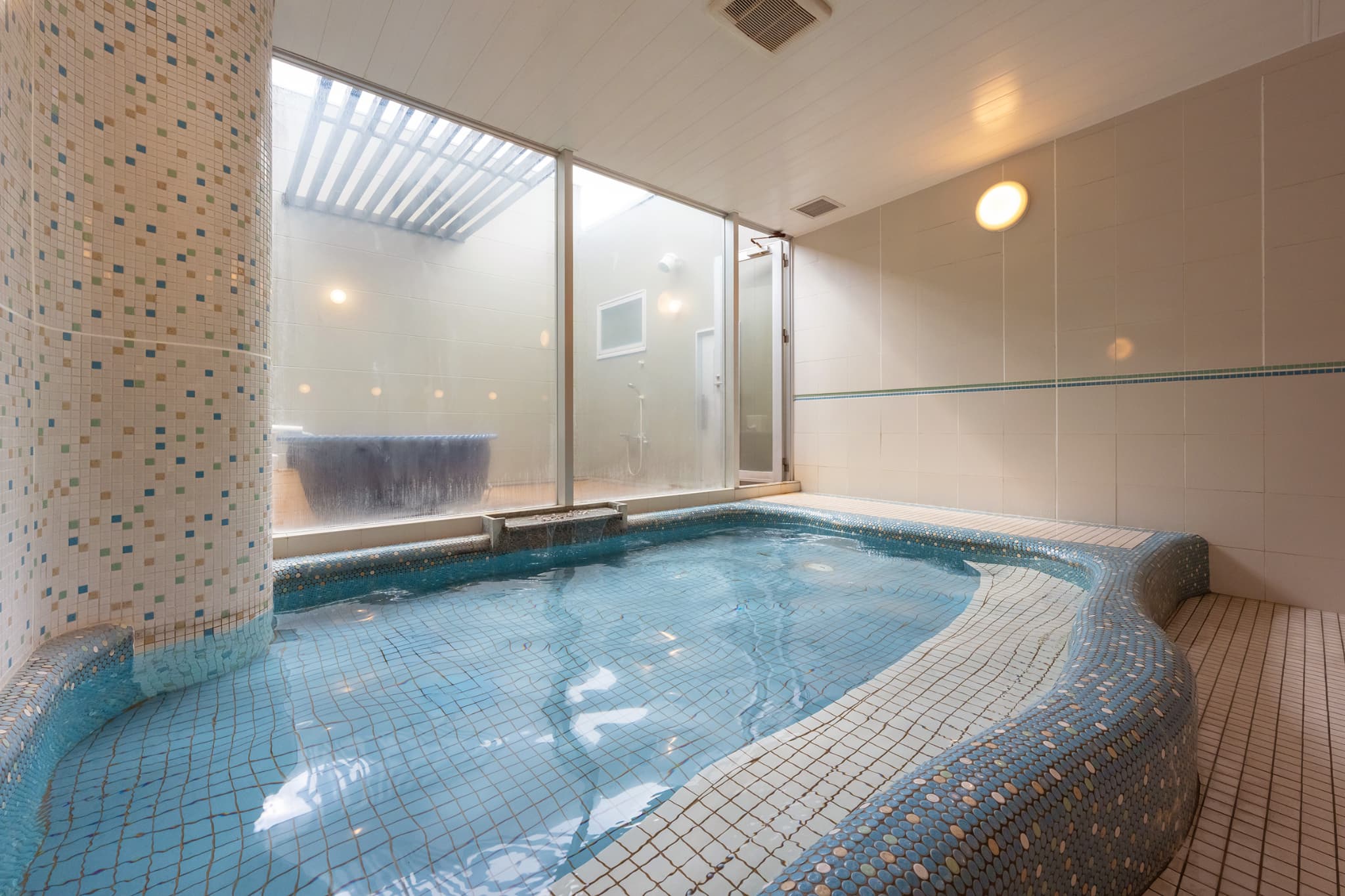 最上階には、露天風呂とサウナを備えた大浴場を完備。男性浴場は和の趣を感じる落ち着いた空間、女性浴場は白と青を基調とした地中海風デザインで、開放感あふれる雰囲気が魅力です。観光や仕事の合間に、心身ともにリフレッシュできる癒しの時間を提供してくれます。