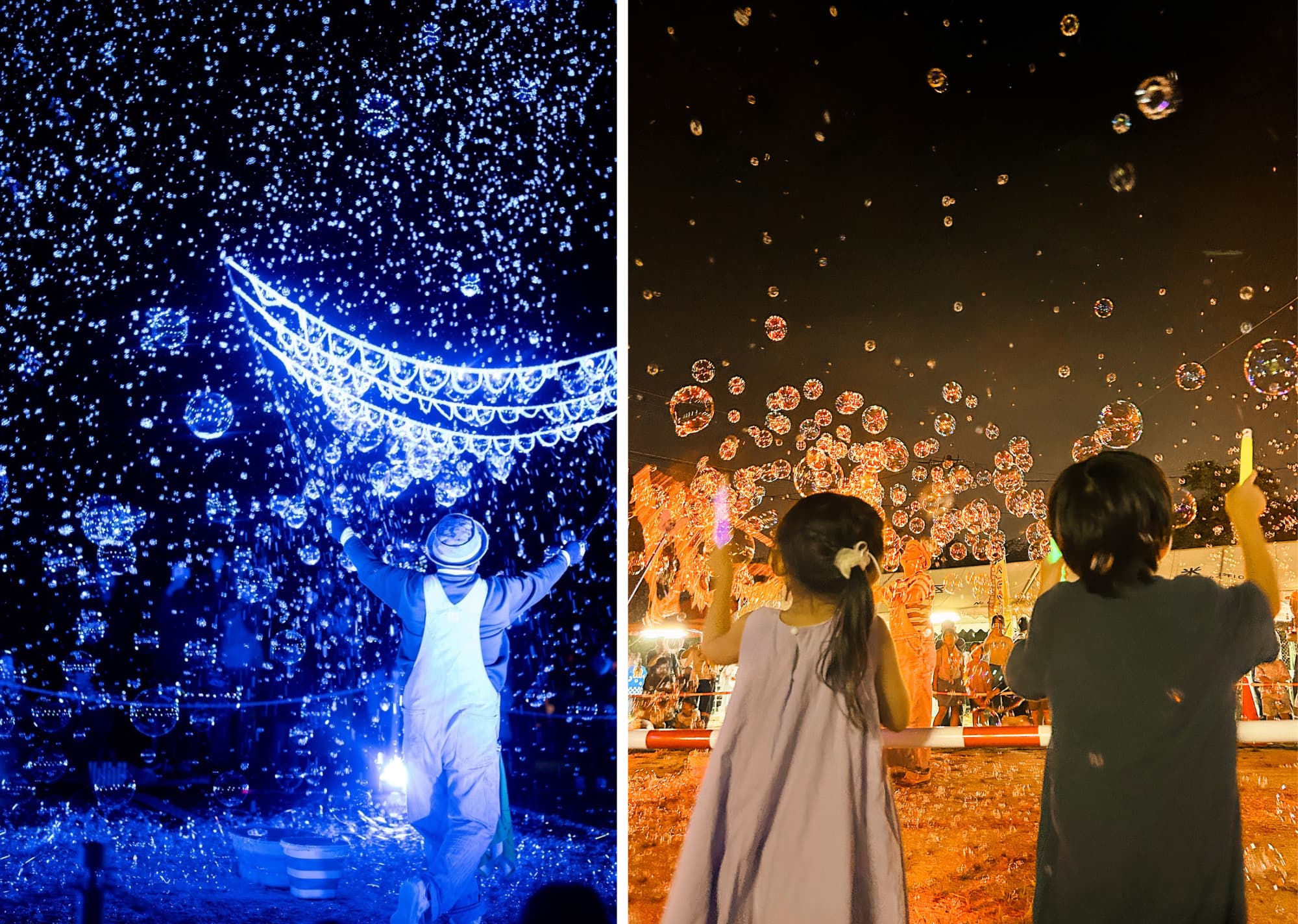 福岡県在住のプロのシャボン玉師「しゃーぼんぼん」によるパフォーマンス「ナイトバブル」は、大小さまざまなシャボン玉と光が融合した幻想的な演出が魅力。まるで絵画の世界に迷い込んだような空間で、儚くも美しい一瞬の芸術を楽しめます。