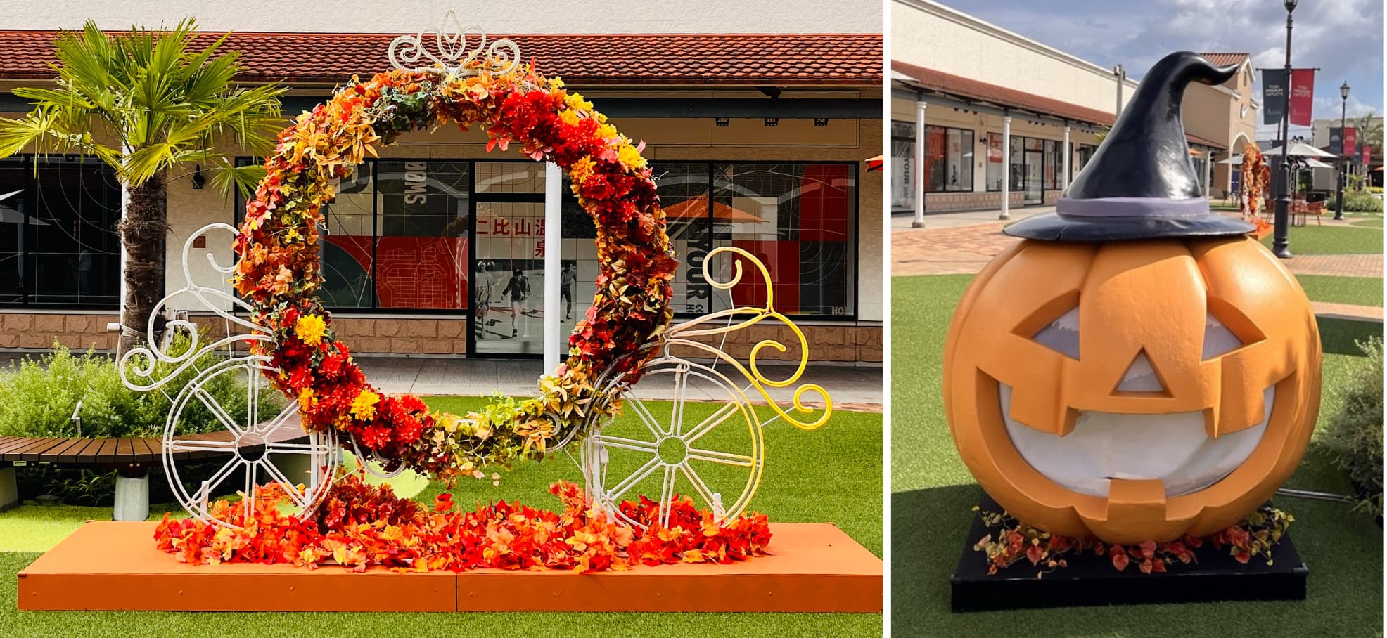 ツリーの裏面には、華やかで大人っぽい絵画のようなデザインの棺が設置されており、棺の中に入って撮影できるフォトスポットも。カボチャや馬車など、ハロウィーンらしいモチーフが色とりどりの花で彩られ、子どもから大人まで楽しめる装飾が場内を華やかに彩ります。