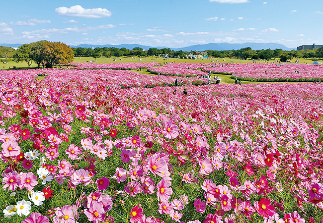 約100万本の広大なコスモス畑や真っ赤に染まるコキア、約1,200株の秋バラに今年初お目見えの赤ソバの花畑など、秋ならではの花景色が楽しめます。今年は100匹を超えるリスザルを間近で観察できる新スポットも。週末を中心に実施されるリスザルのエサやり体験やインコの手乗り体験(有料・先着受付)といった動物と触れ合えるイベントも人気。