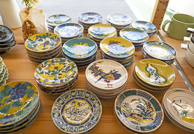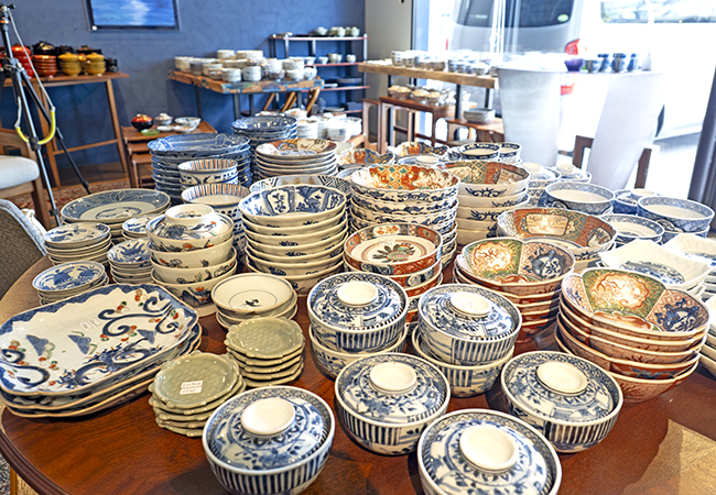 モダンな店内には、「日々の暮らしに彩りを」をテーマに買い付けた江戸中期からの銘品が並んでいます。通常骨董(こっとう)品は5枚セットなどで売られることが多いですが、1枚から購入できるので手軽に器を楽しむことができます。いにしえの職人が描いた緻密な絵付けも見どころです。