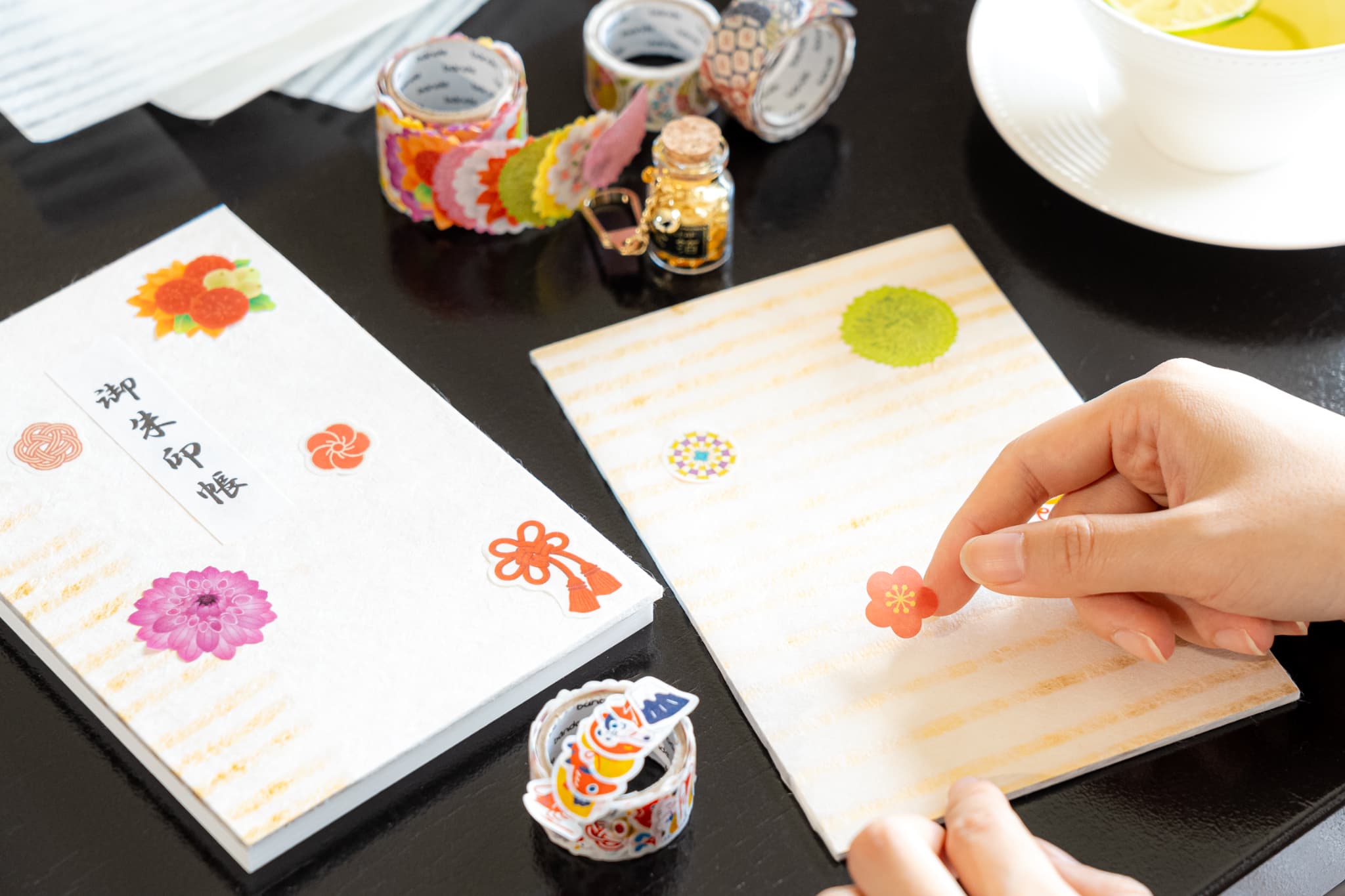 このプランの目玉は、佐賀県の伝統工芸「名尾手すき和紙」を使ったオリジナル御朱印帳づくり。チェックイン時に好みの和紙を選び、客室でゆっくりと制作できます。縁起の良い水引や鯛モチーフのマスキングテープなども用意されており、自由な発想で自分だけの一冊が完成します。