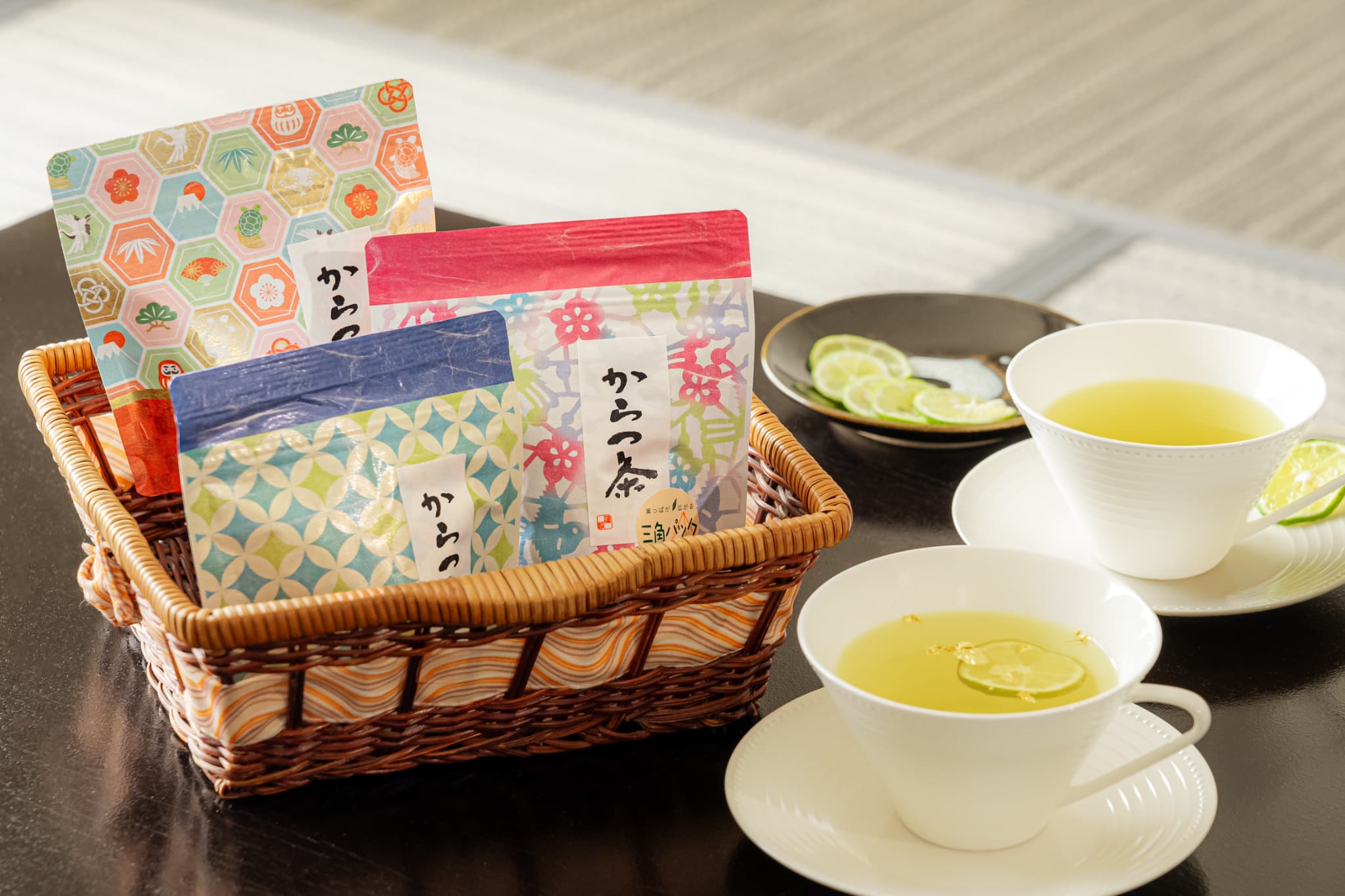 客室には、唐津産の玉緑茶「からつ茶」と柚子スライス、そして金箔がセットで用意されます。金箔は財運や繁栄の象徴とされ、柚子の香りとともに邪気を払う縁起の良い一杯が楽しめます。金箔は御朱印帳の飾りにも使えるので、旅の思い出づくりにもぴったりです。
