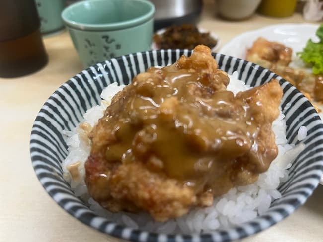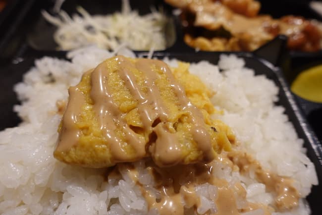 中身がなにかはわからないのだが、たぶんマヨネーズ、ウスターソース、胡椒あたりは入っているのではないだろうか、絶妙な甘辛さ。このソースと揚げ物の相性が、もう尋常じゃなく良いのである。ちなみに付け合わせの卵焼きとも合う。中毒性さえある。