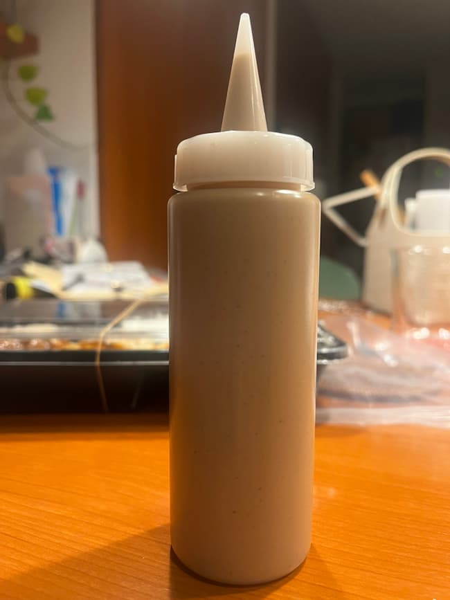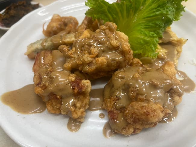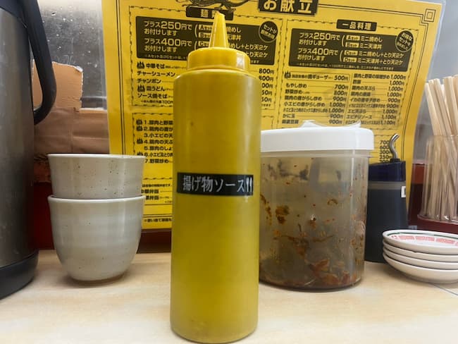 こちらがその「揚げ物ソース」である。黄色い容器に入っており、客は各々好きな量を揚げ物にかける。あまりかけすぎるのも悪いなと思いつつ、結局はドバドバとかける。
