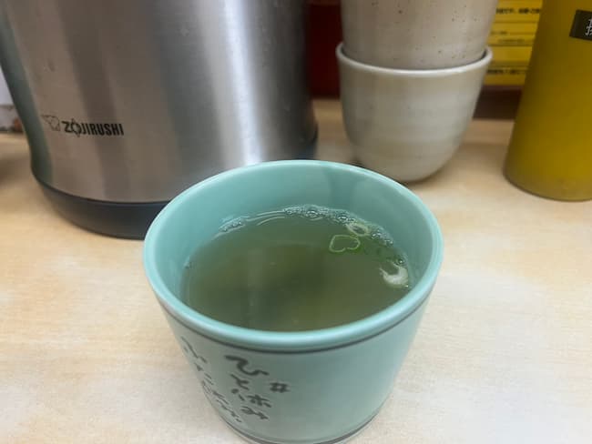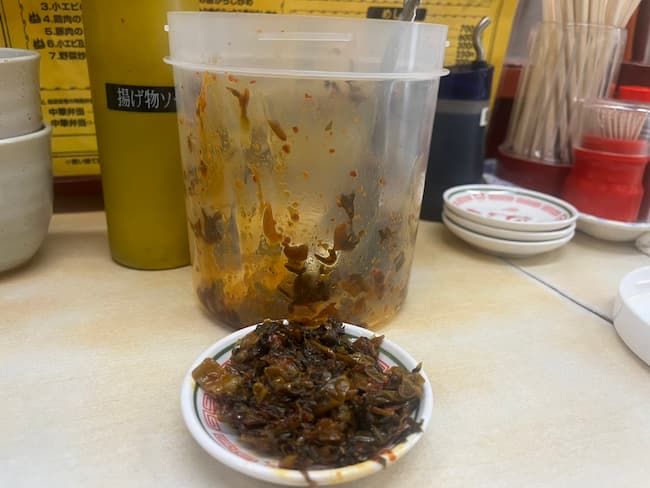 山庄は、ポットから鶏スープを自分で注いで飲むスタイル。またピリ辛の辛子高菜も自分でとることができ、これらもいちいち美味しい。