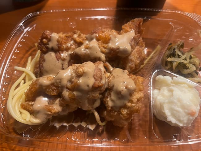 かくして揚げ物ソースをお迎えしたのだが、みんなドバドバ使ってた割には、まだしっかり残っている。山庄の6番のテイクアウトを毎日するわけではない。 ある日、子どものサッカーの試合を送迎し、帰宅が遅くなったので、某お弁当チェーンで唐揚げ弁当を購入。山庄の揚げ物ソースをかけてみた。