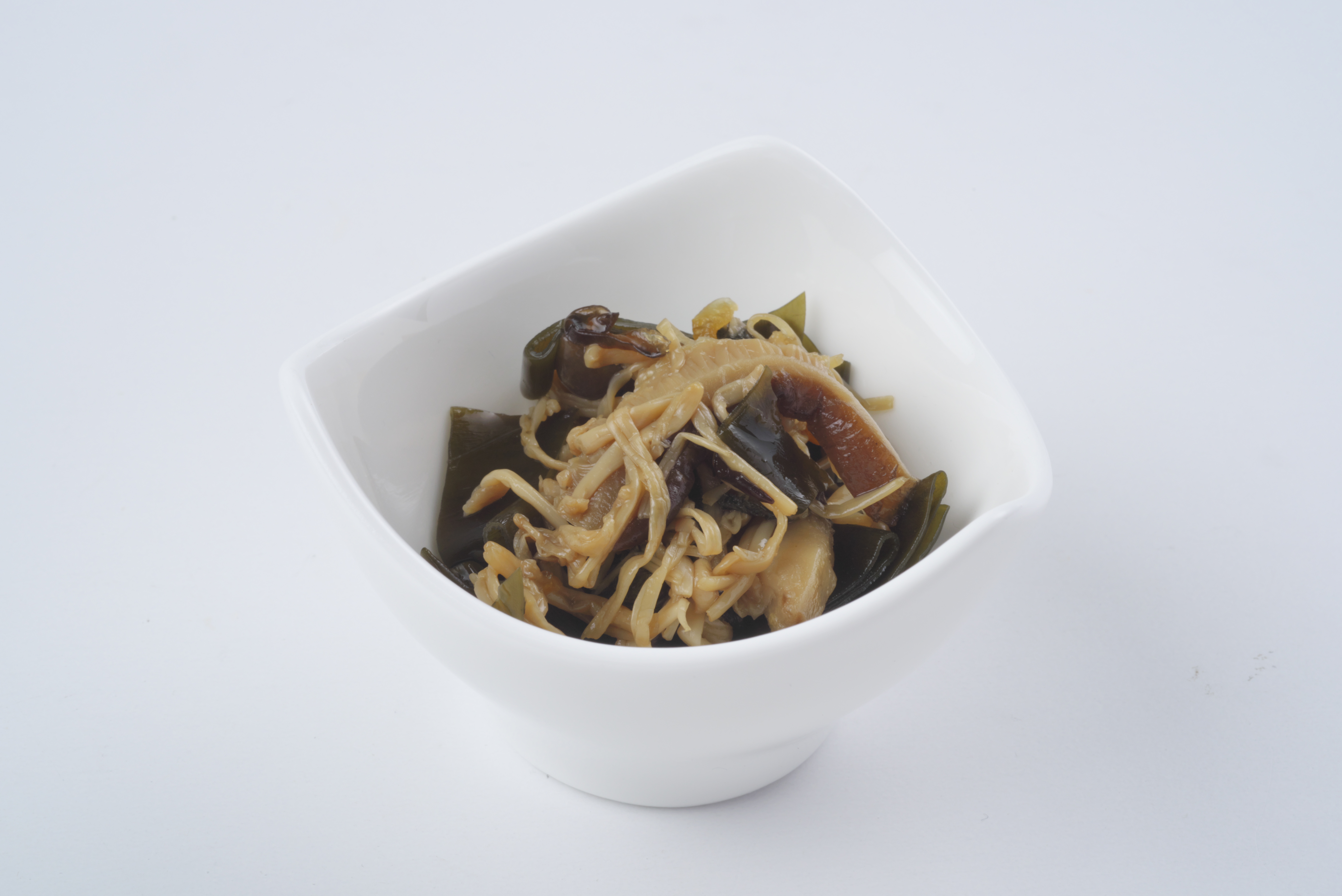 もう一つ、「農家おもてなしおせち」初年度からずっと入っているメニューをご紹介します。「きのこの佃煮」です。大山町特産のエノキダケ「マッシルク」は、傘が小さく歯触りの良さが特徴。皆さんも店頭で見かけたことがあるのでは?このエノキダケと、シイタケ、クロキクラゲ、コンブを和えて佃煮に。レストランでも人気のメニューです。