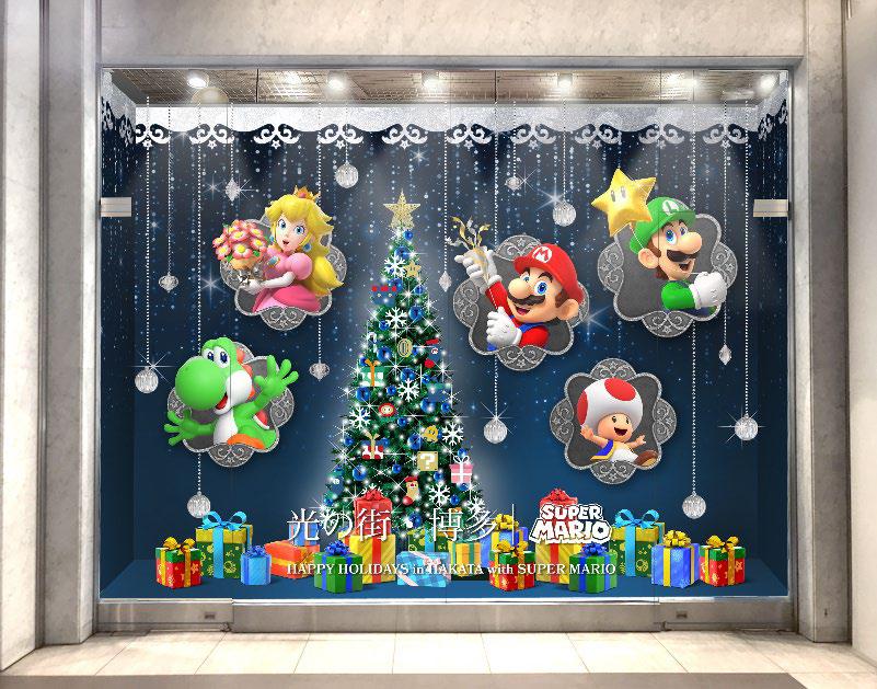 博多駅のコンコース沿いのショーウィンドウや、アミュプラザ博多3階吹き抜けなど、JR博多シティ館内にも「スーパーマリオ」のキャラクターたちが彩るホリデースポットが登場します。