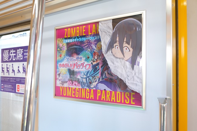 地下鉄車両のドア横には、劇場版「ゾンビランドサガ ゆめぎんがパラダイス」のメインビジュアルポスターが配置されています。お腹が空いた山田たえが、ところどころポスターをかじっているキュートなビジュアルです。