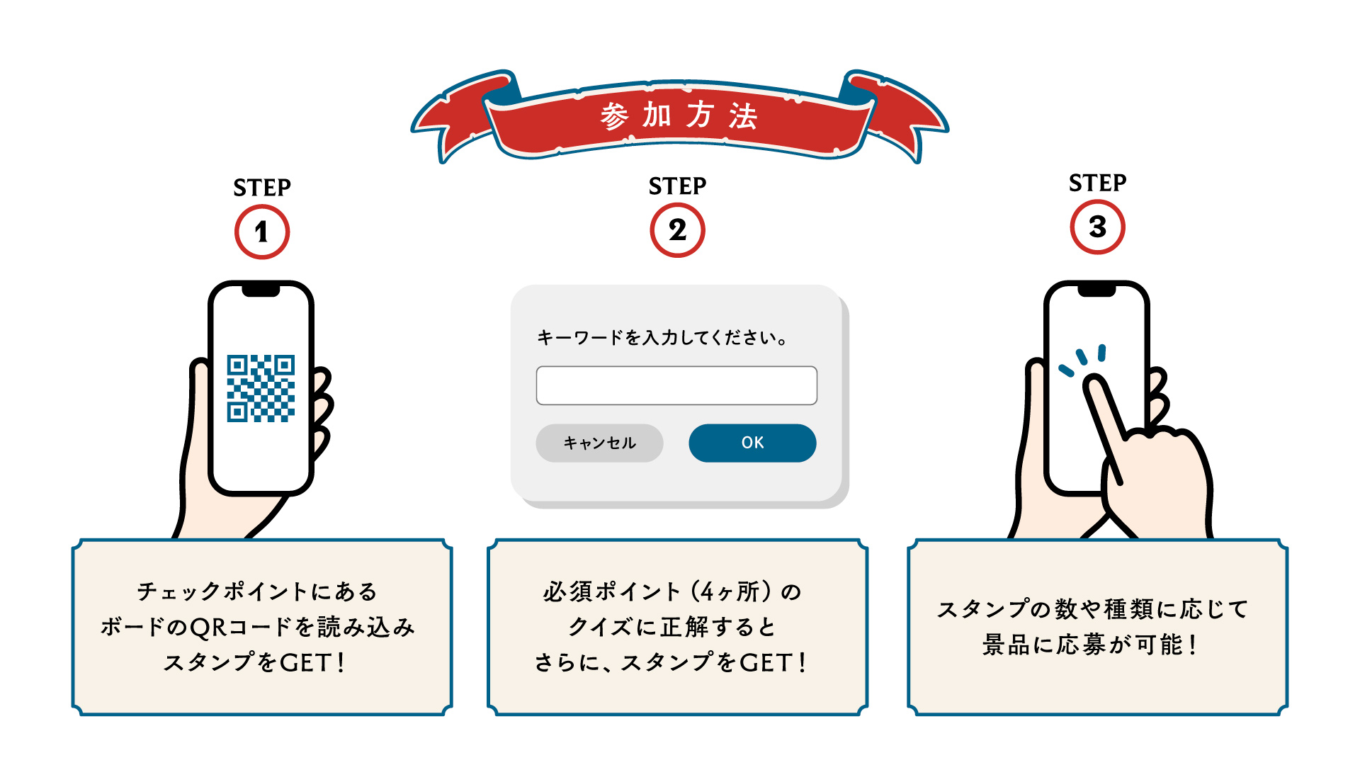 参加は簡単!専用のサイト(RALLY)にアクセスして、チェックポイントにあるボードのQRコードを読み込みスタンプをGETするだけ!また、必須ポイントにあるクイズに正解すると、さらにスタンプをGETできます!