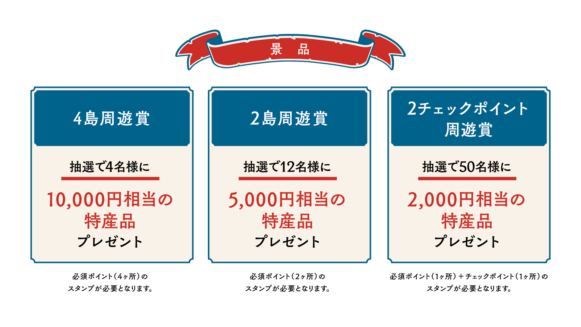 一支国博物館、対馬朝鮮通信使歴史館、五島観光歴史資料館、鯨賓館ミュージアムのいずれか一つのスタンプが付与されていることが景品の応募条件となります。