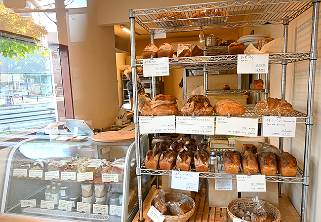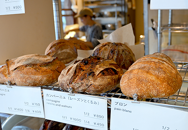 小麦と水、塩、酵母だけを使ったシンプルな製法で仕立てるパンのラインアップは「カンパーニュ」(400円〜)や「ブロン」(400円〜)など、ハード系のパンを中心におよそ8種類。