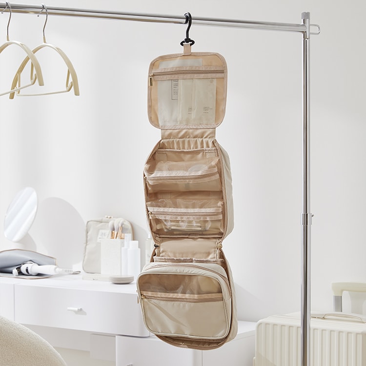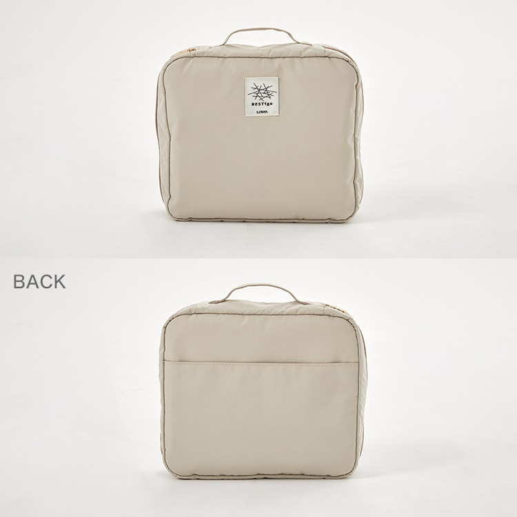 必要なポーチだけを取り外せたり、ボトルもしっかり支えるゴムバンドを内蔵するなど機能性抜群。撥水加工&光沢生地で、機能性と美しさを両立。