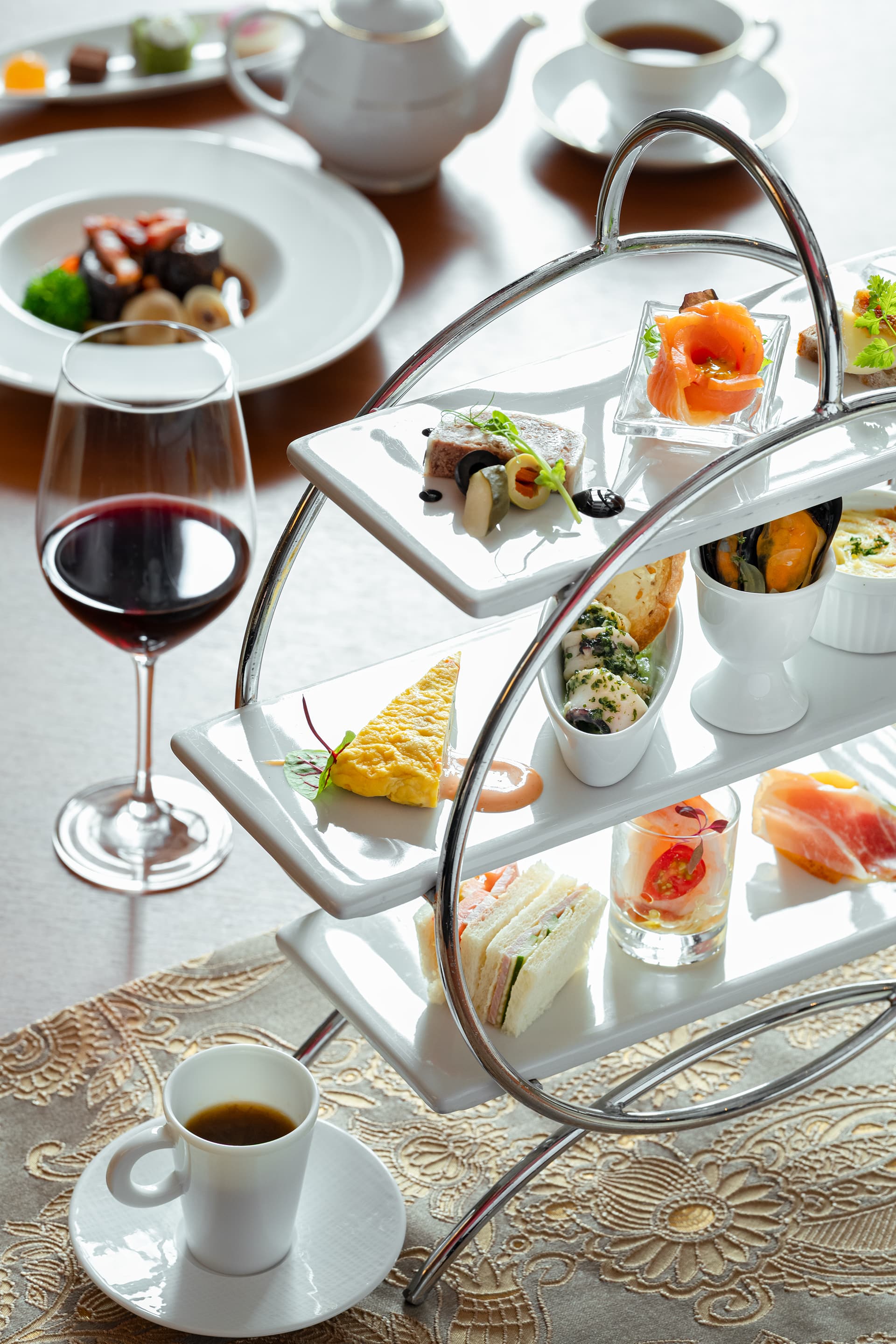 三段トレイには、約10種類のオードブルが彩り豊かに並びます。冷菜には「ブリーチーズ クルミパン添え」や「サーモンマリネ ハニーマスタードソース」、「シュリンプカクテル」など、ワインや紅茶との相性も抜群。温菜には、フランスの家庭料理をベースにした、じゃがいもとひき肉を重ねたグラタン「アシ・パルマンティエ」やムール貝を白ワインで蒸した「ムール・マリニエール」など、ホテルならではの味わいが揃います。