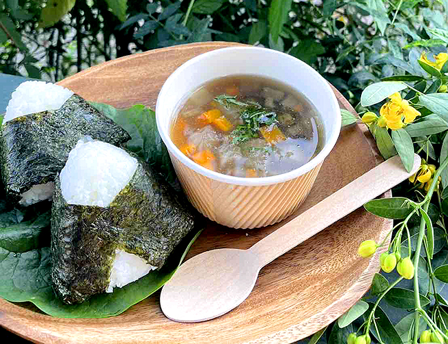 温かい郷土料理「のっぺ汁」とおむすびがセットになった、菊池の恵みランチセット(800円)が提供されるほか、〝美のミネラル〟と呼ばれるシリカを含む「THE KIKUCHI WATER―菊池の天然水」や、アイガモ農法で育った菊池産の新米(ヒノヒカリ)、アールスメロンをはじめ採れたての野菜・果物の販売もあります。