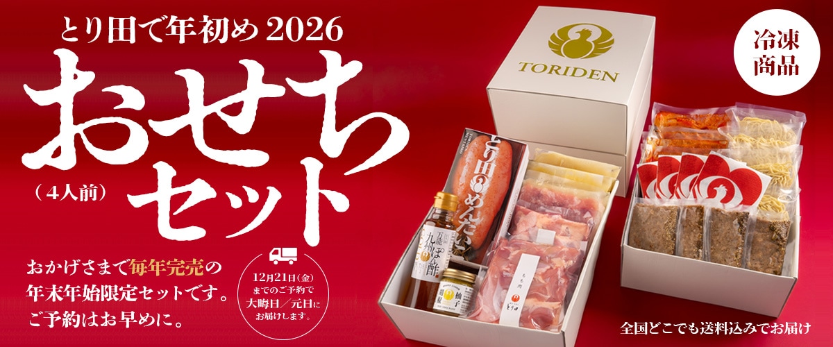 さらに、とり田特製の明太子や紙エプロンも同梱されており、年末年始のギフトにもぴったり。冷凍便で届くため、忙しい年末でも安心して準備できます。