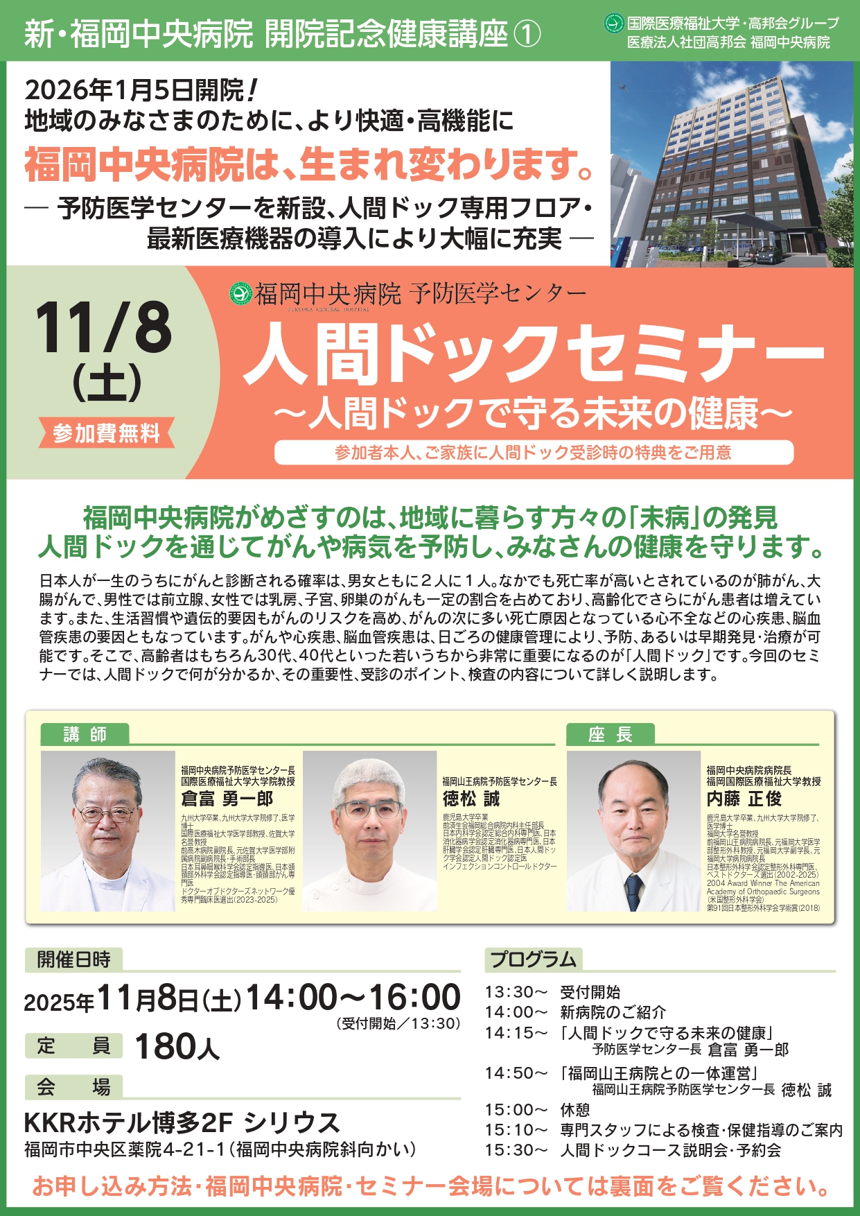 テーマ: 人間ドックで守る未来の健康 日 時: 2025年11月8日(土)14:00〜16:00(受付13:30〜) 会 場: KKRホテル博多 2F シリウス(福岡市中央区薬院4-21-1) 定 員: 180名(参加無料)
