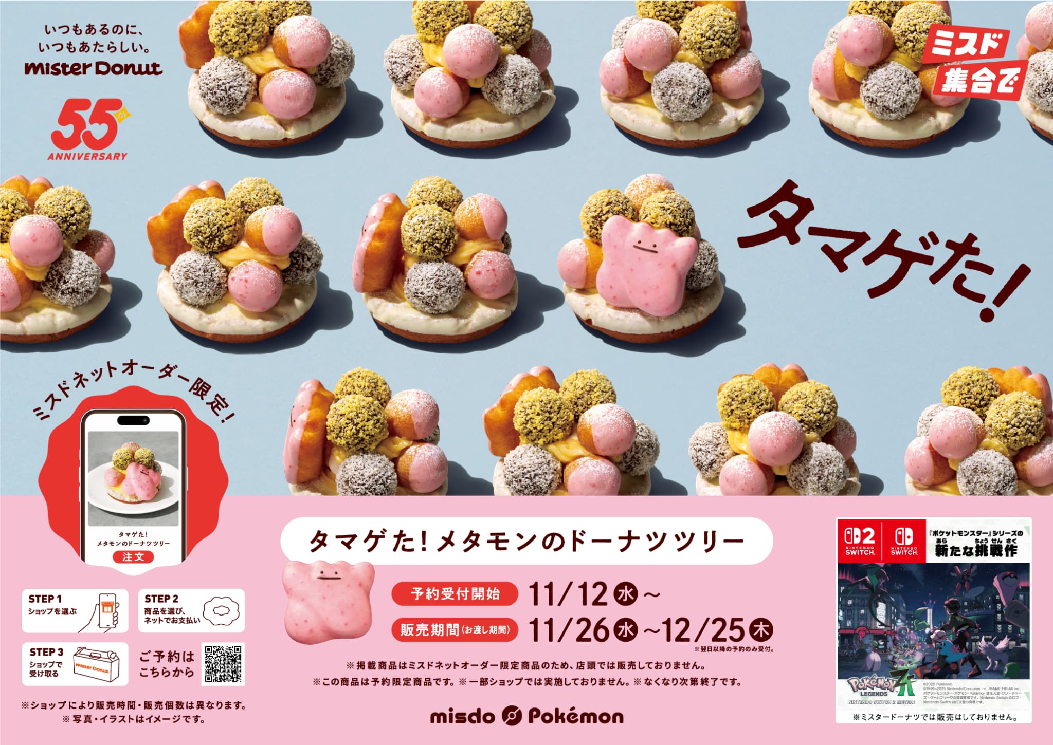 ミスタードーナツから、ポケモンとのコラボによる期間限定商品「タマゲた! メタモンのドーナツツリー」が登場。ミスドネットオーダー限定での販売で、予約受付は2025年11月12日(水)から、商品受け渡しは2025年11月26日(水)よりスタートします。