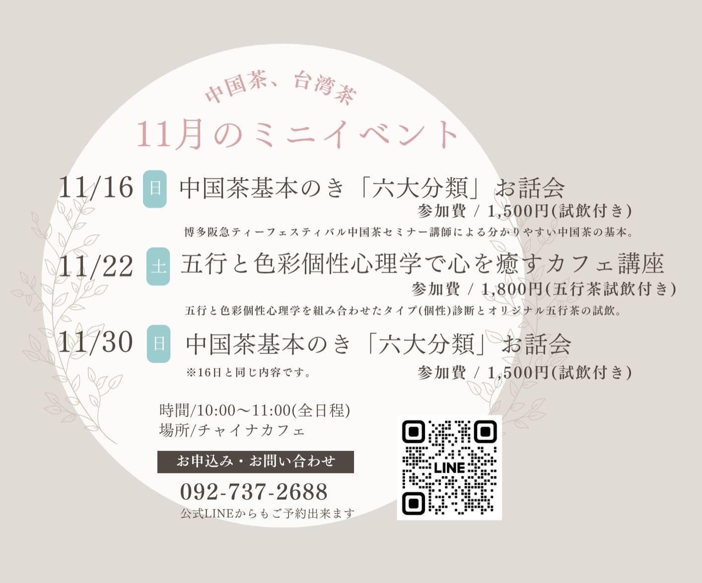福岡市中央区今泉にある本格中国茶専門カフェ「CHINA CAFÉ(チャイナカフェ)」で、秋の心と体を整えるミニセミナーが開催されます。中国茶や台湾茶に興味がある方はもちろん、リラックスした時間を過ごしたい方にもぴったりの内容です。
