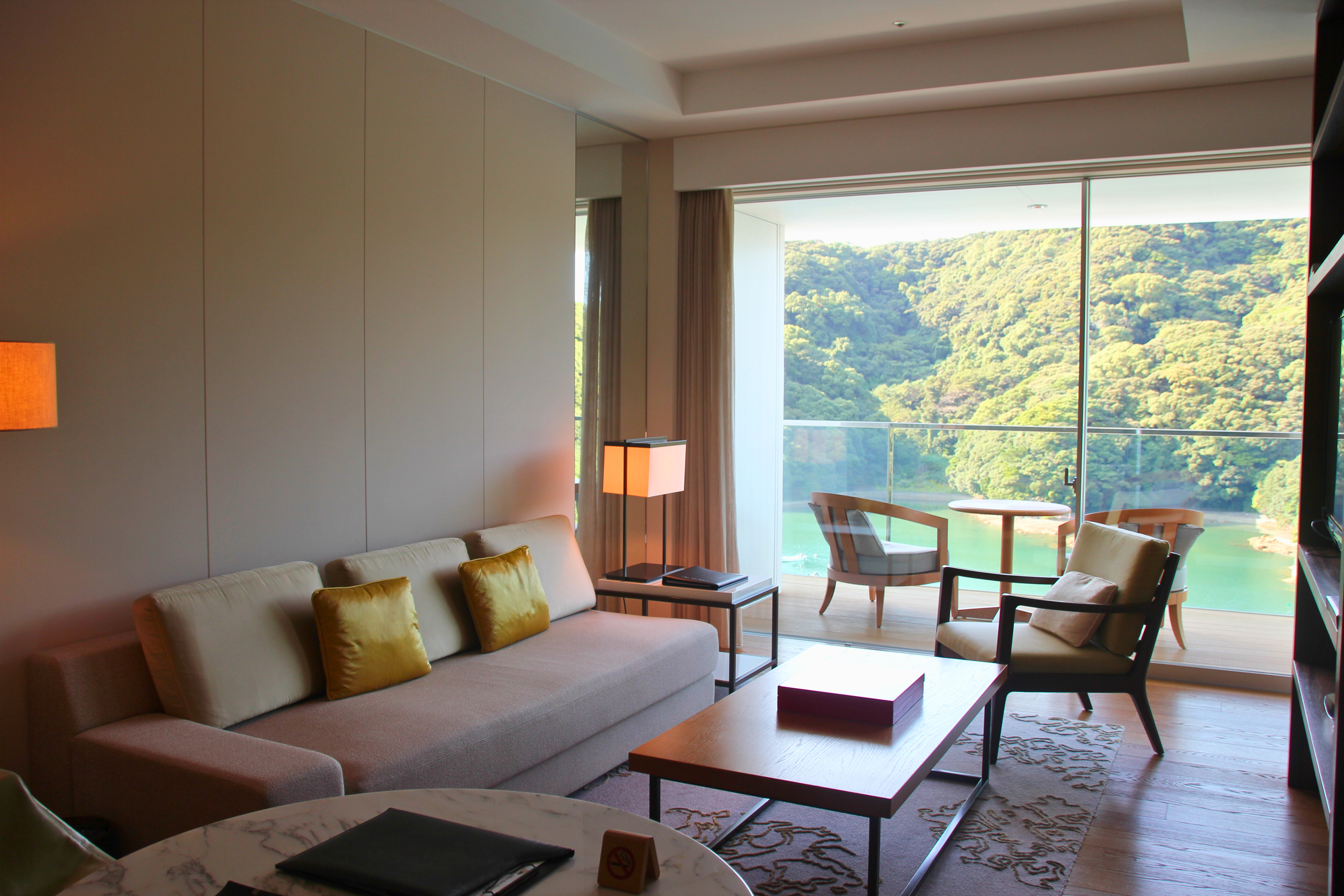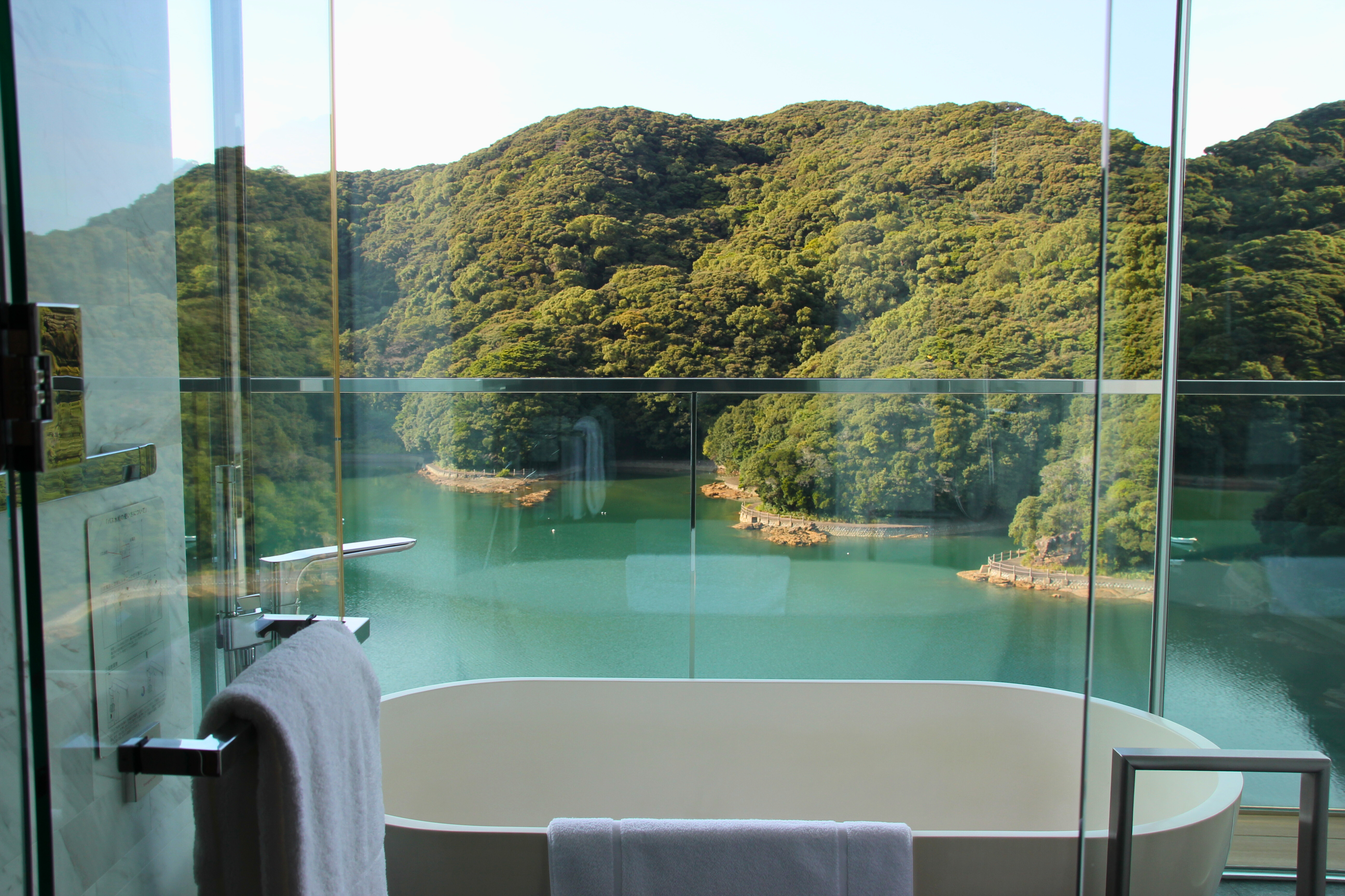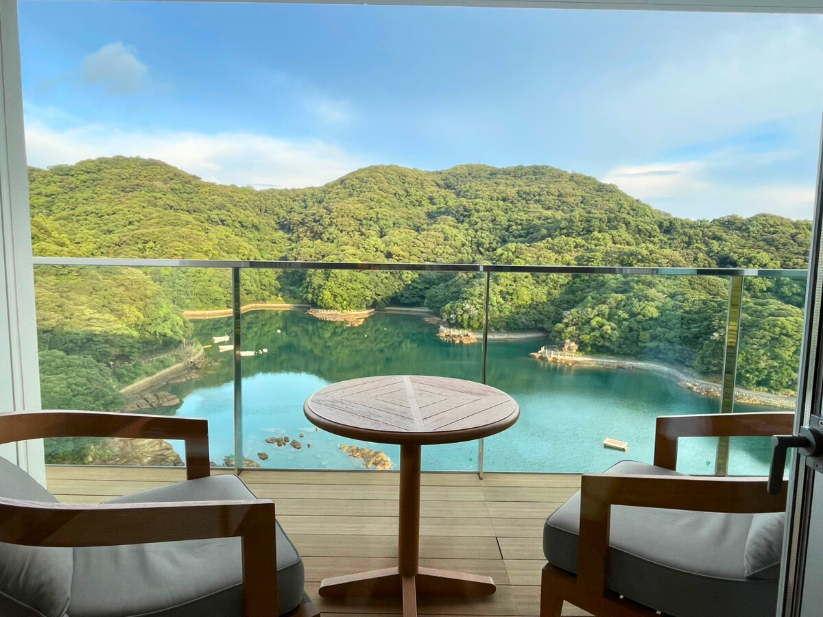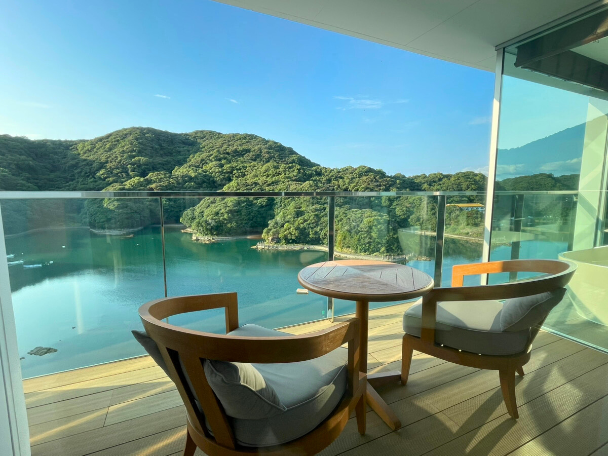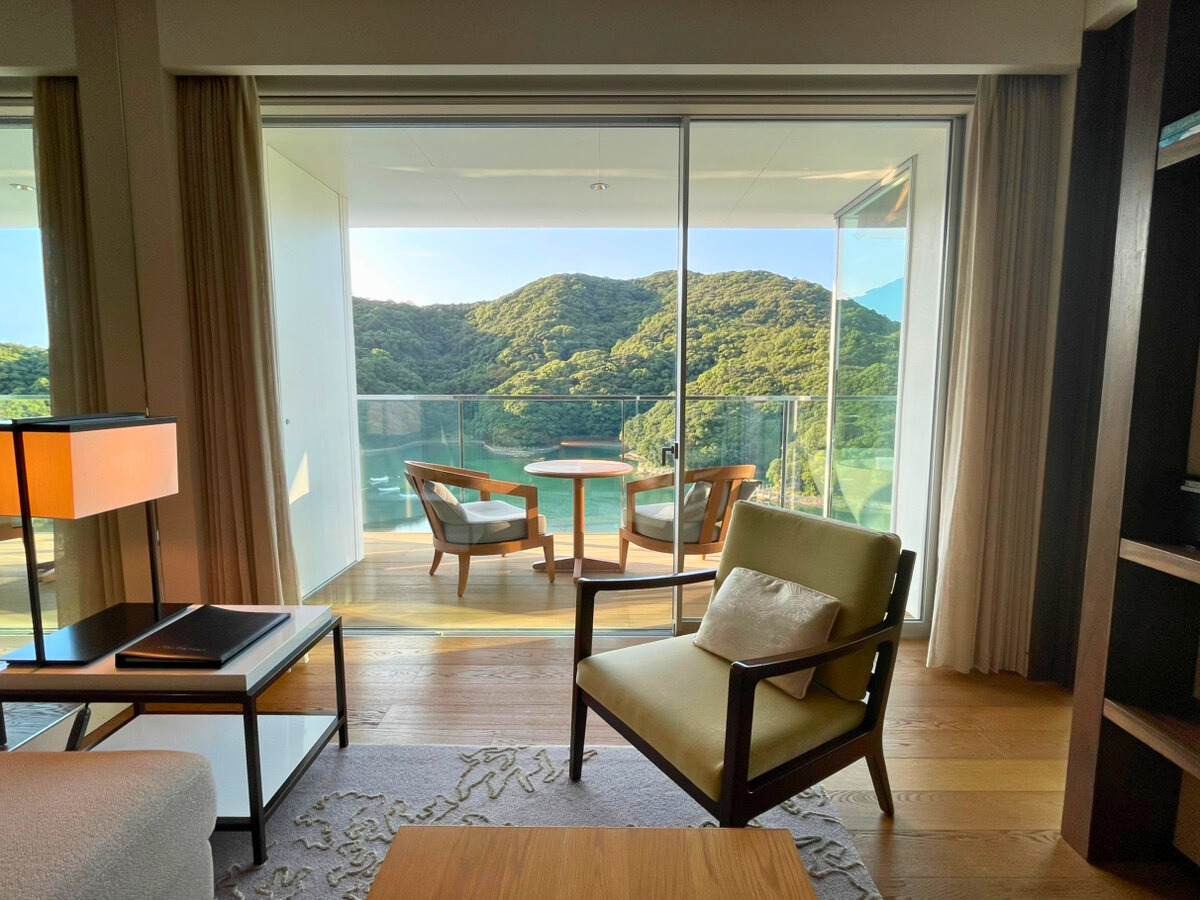 全面ガラスから望む紺碧の入り江、対岸の緑濃い自然、英国ブランドの上質なアメニティ、そして世界的建築家・隈研吾氏が手掛けた洗練された空間─。