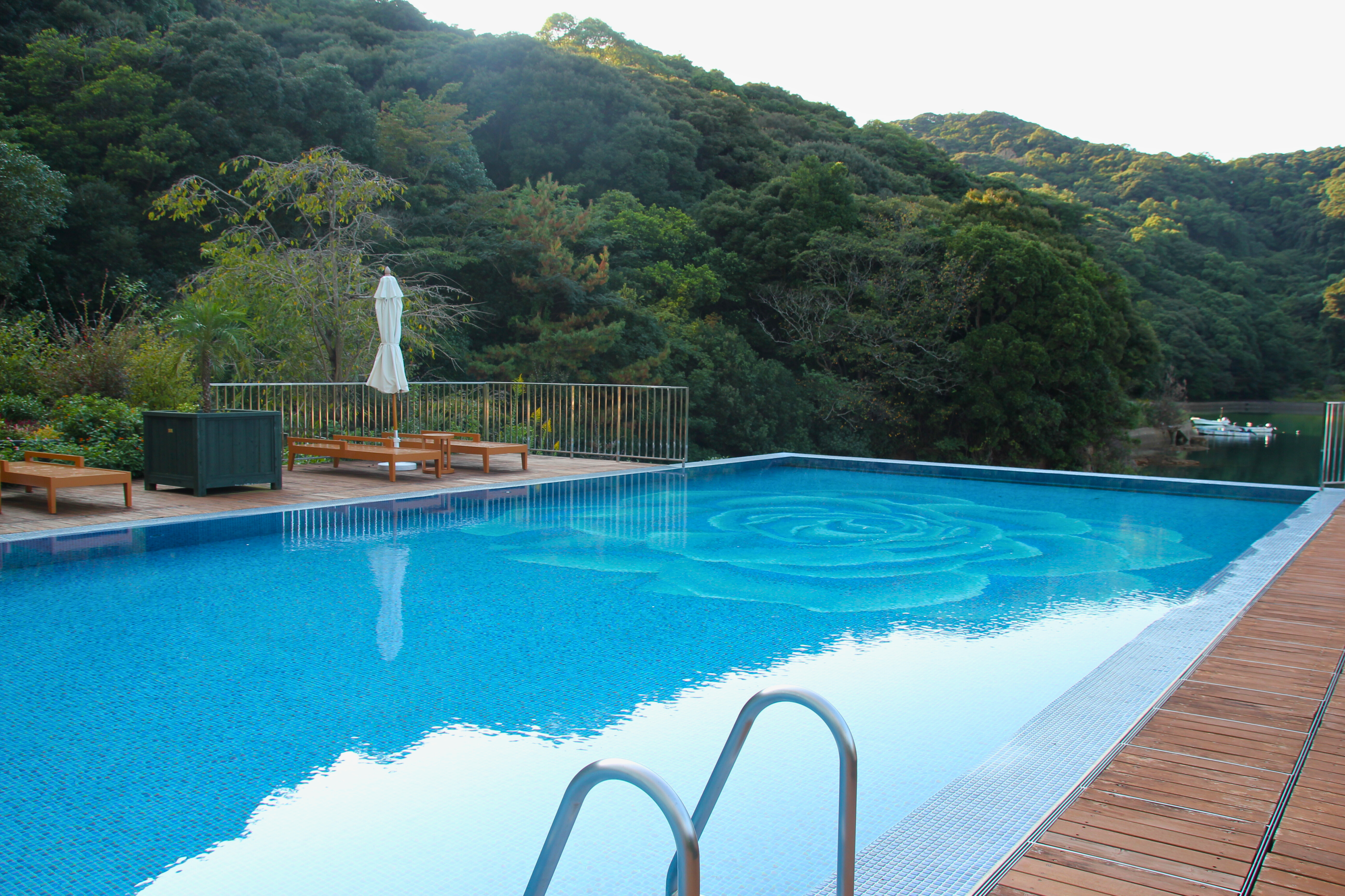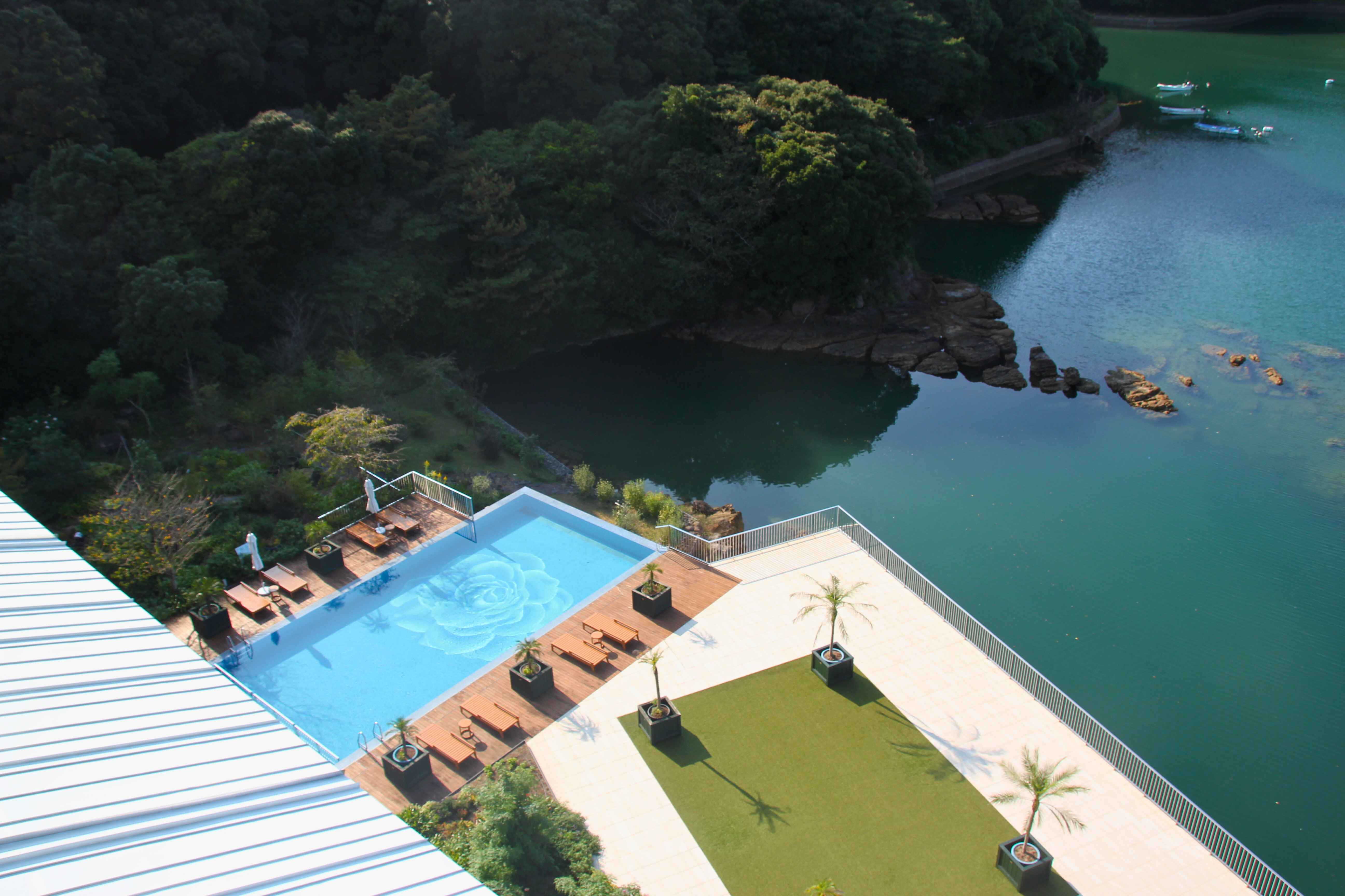 プールサイドからは大島の入り江が一望でき、まるで海外リゾートに来たかのような開放感が。