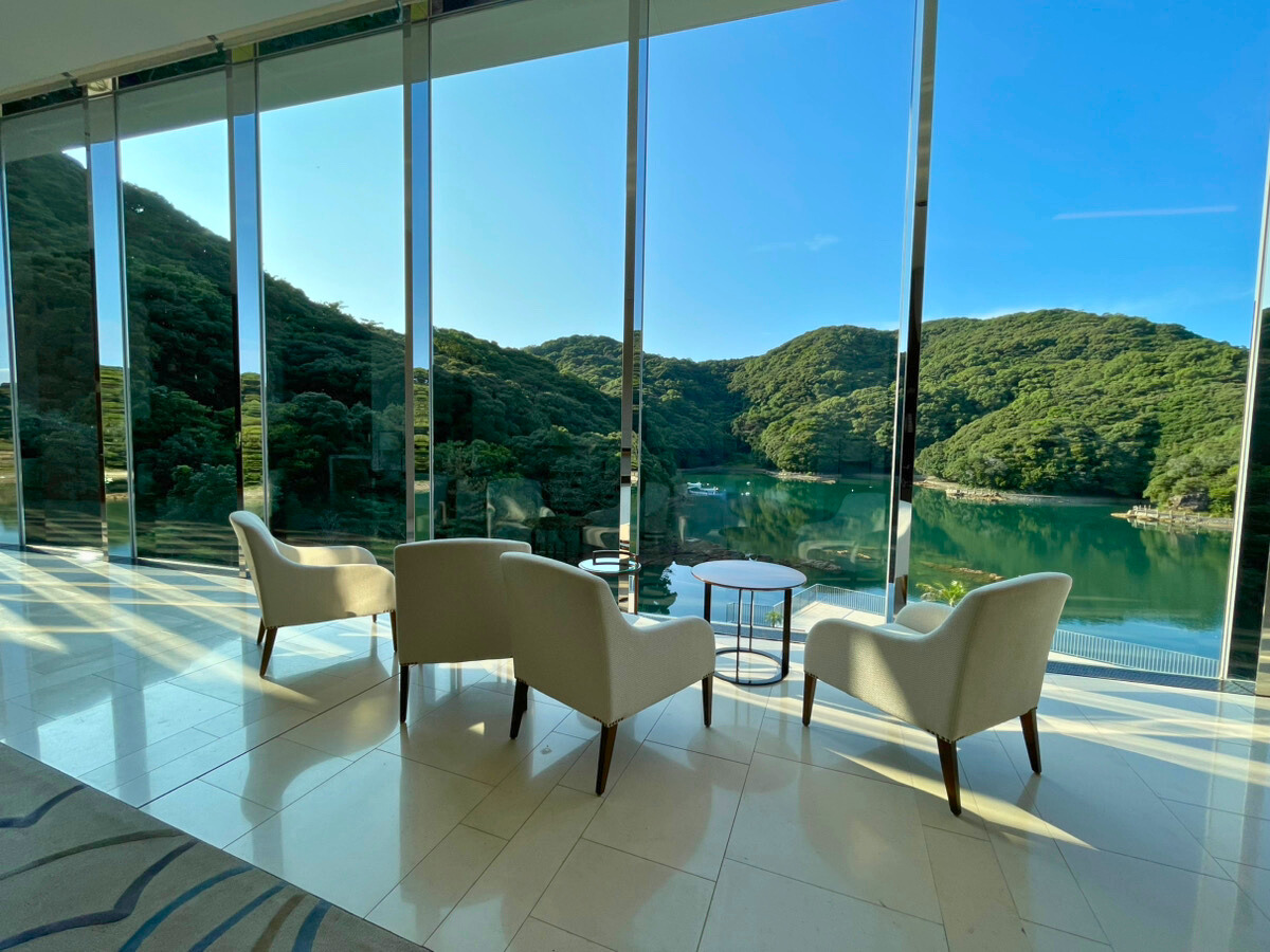 ロビーのソファに腰掛けて、大きな窓から絶景の入り江と自然を眺めているだけで、肩の力がすっと抜けていくのを感じます。休日も良いですが、平日だからこそ味わえる“静けさ”も何とも贅沢な時間です。