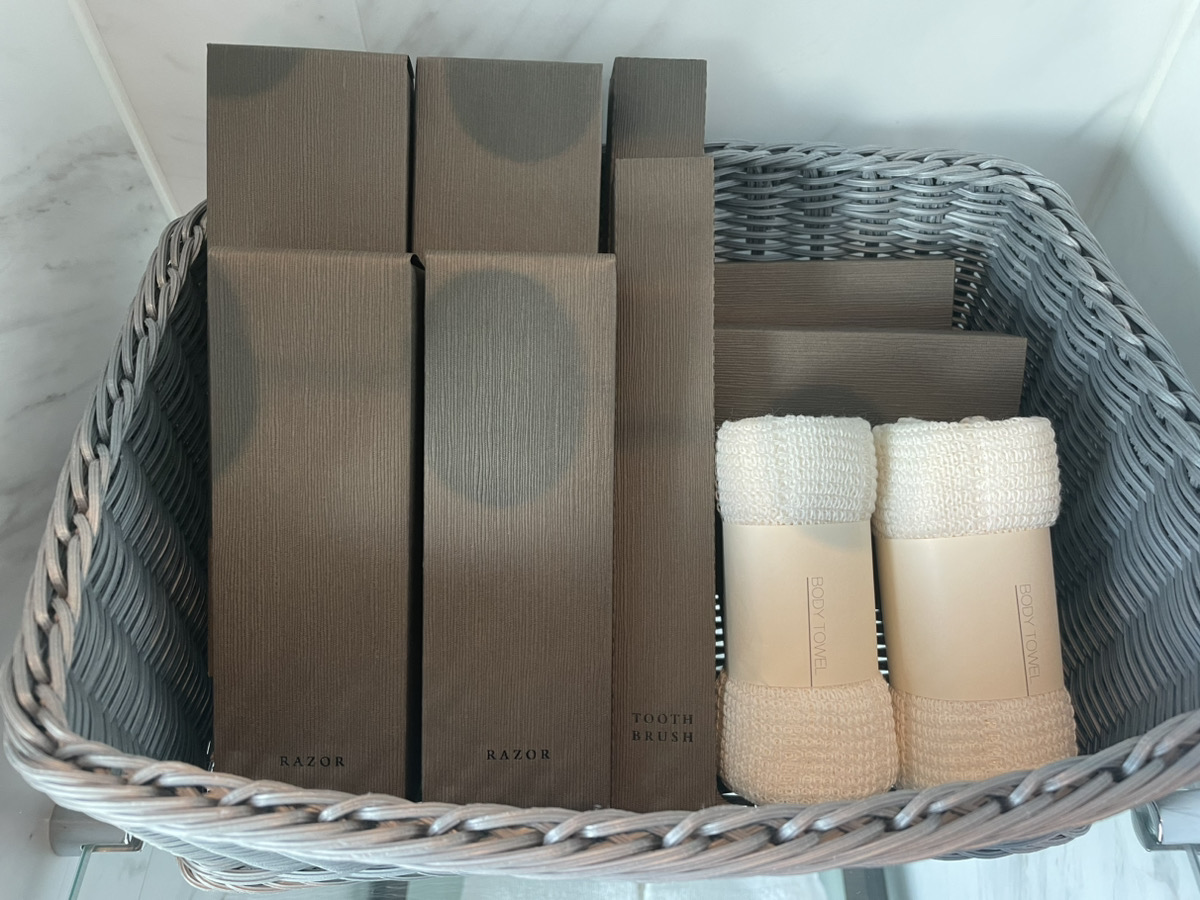 そのほか、歯ブラシ、ヘアブラシ、ボディウォッシュタオル、綿棒、バスローブなど、必要なアメニティはすべて揃っているので、身軽に訪れても安心です。タオル類も上質で、触れた瞬間からリゾート気分を味わえます。