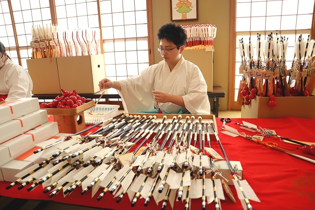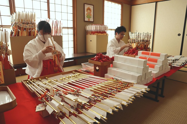 鷲尾愛宕神社の桜の間ではこの日、年末年始の参拝者に授与する「破魔矢」作りが進められていました。“悪い気を吸い取る”とされる赤いひょうたんを付けた開運・縁起物の破魔矢などを神職と巫女(みこ)が一つずつ丁寧に仕上げています。