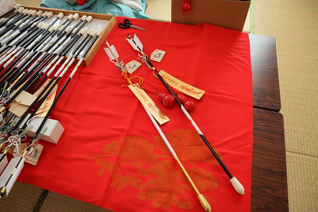 授与された破魔矢は「神棚や床の間など、お祭りするのにふさわしいところに置いてください」とは神職の柴田昌閲さん。立てかけても横にしていてもよいそうです。