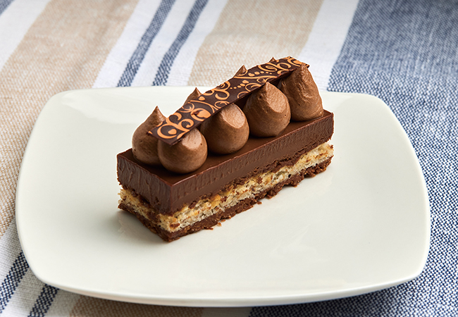 ビターチョコレートのクリームに、ヘーゼルナッツ生地、アーモンドのプラリネを組み合わせた、食感も楽しい一品。