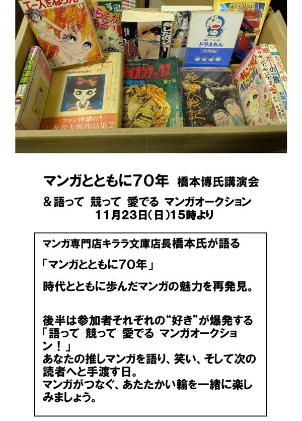 来たれマンガマニア!11月23日 開催 マンガとともに70年 橋本博氏講演会&語って 競って 愛でる マンガオークション