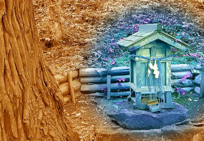 旅姿の若い男が大きな森の入口にある神社で真剣に祈っていた。