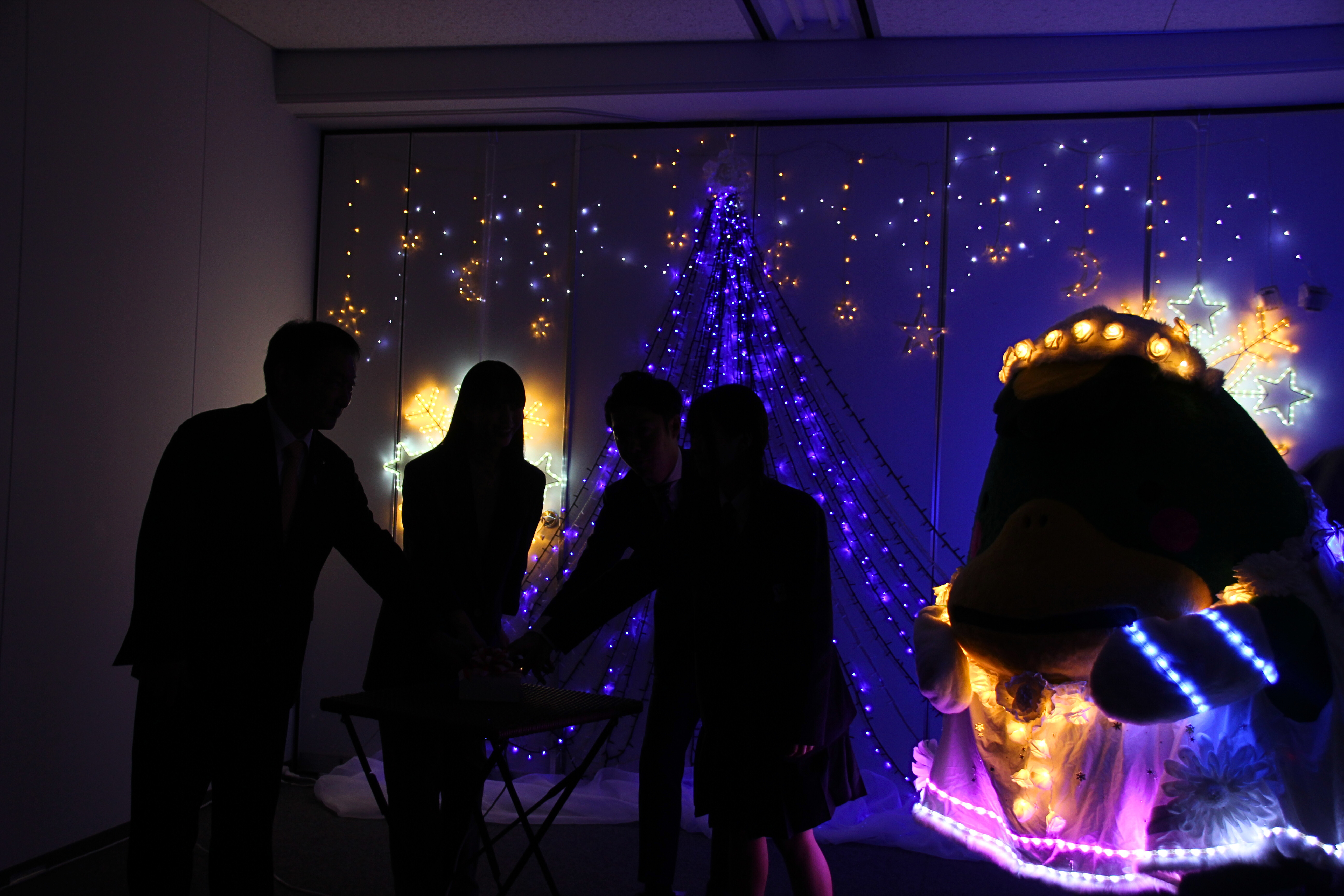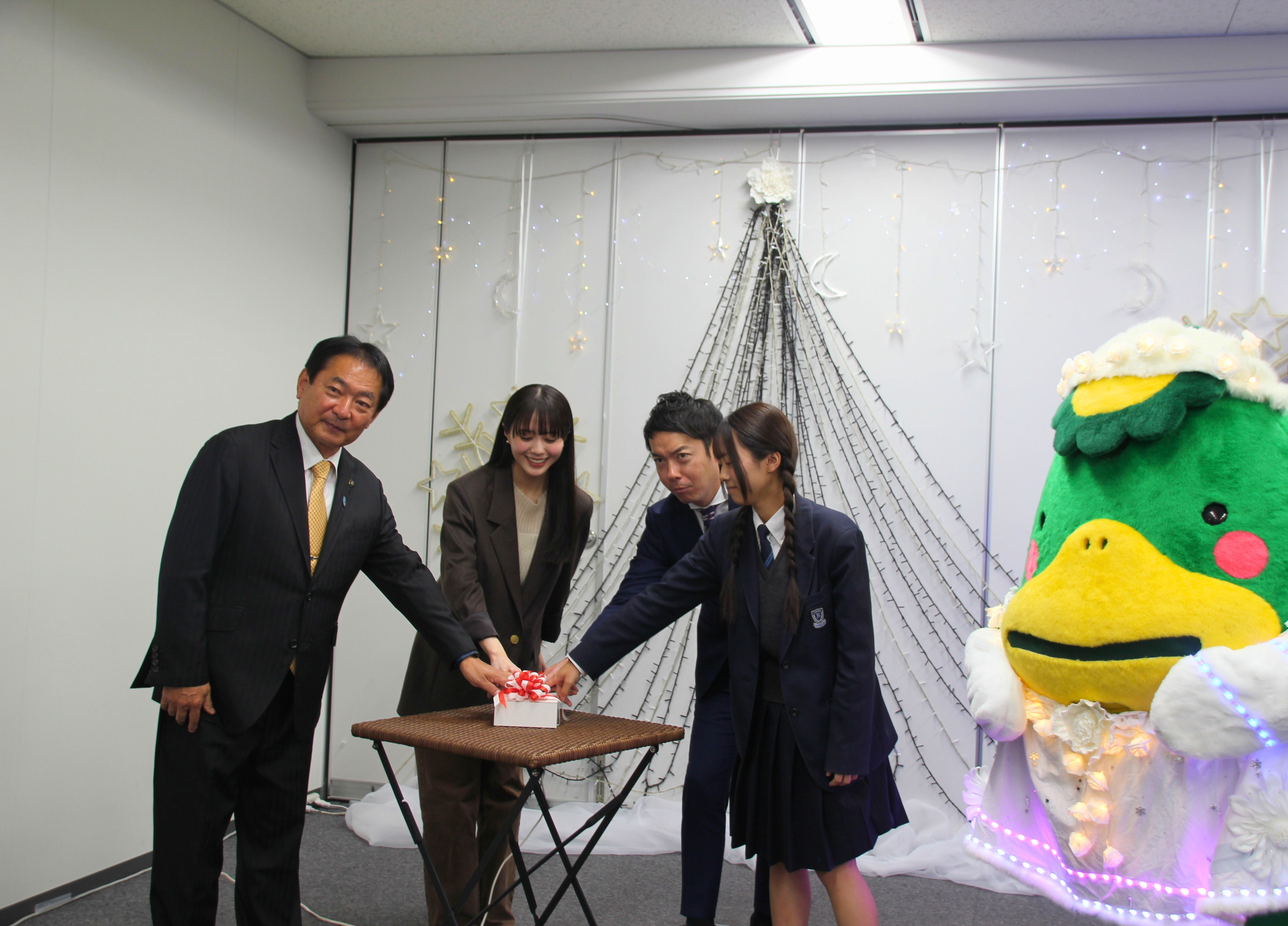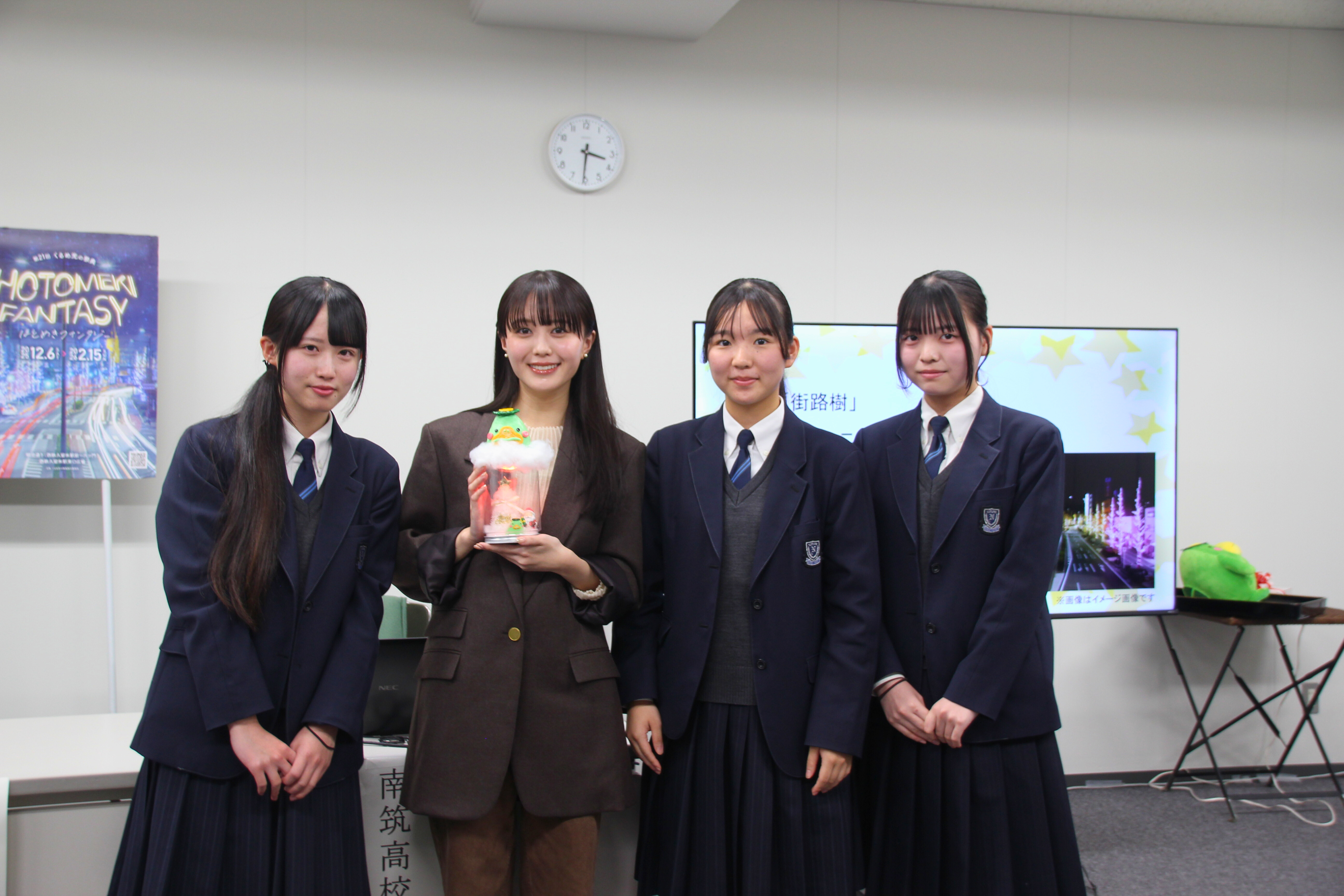 その後、榎本ゆいなさん、原口新五久留米市長、実行委員会、南筑高校地域協創クラス生徒、久留米市イメージキャラクター・くるっぱによる「ミニ点灯式」も開催されました。