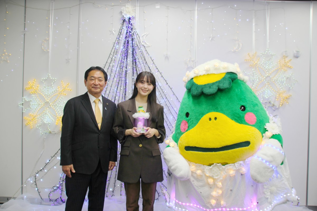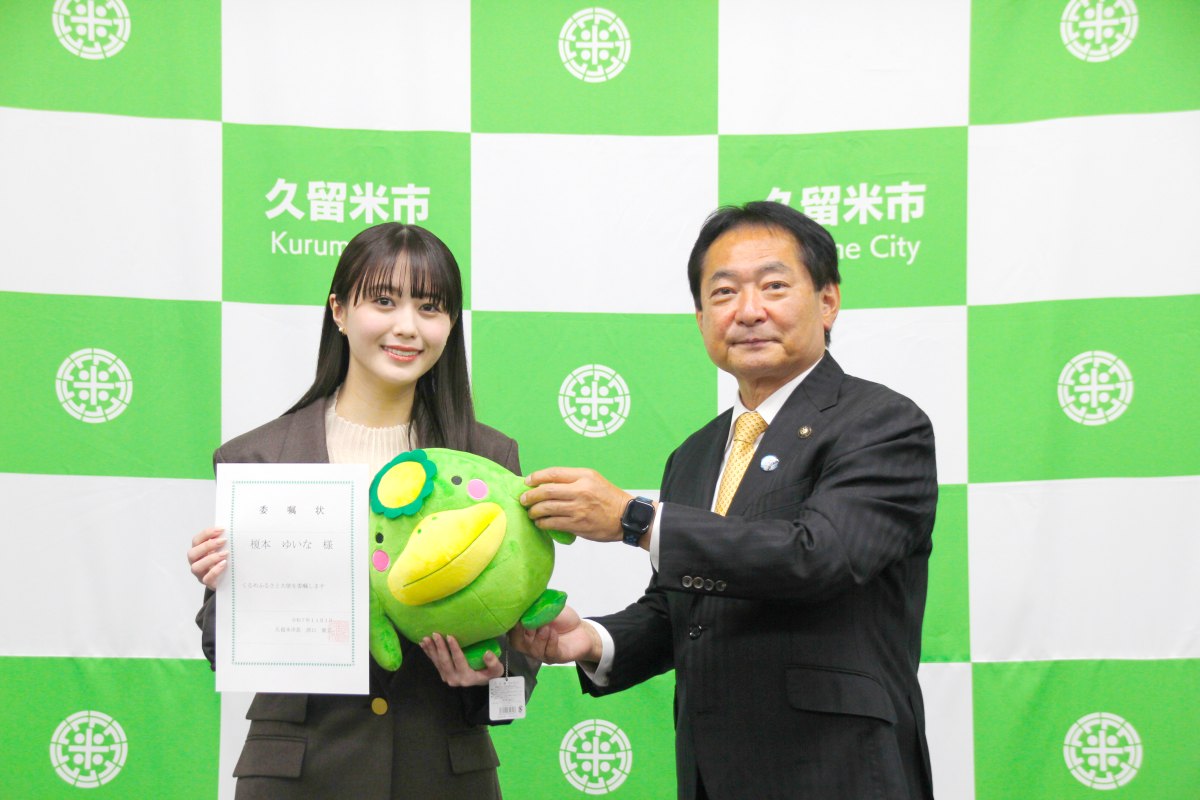 久留米市イメージキャラクター「くるっぱ」と、「くるめふるさと大使」榎本ゆいなさん