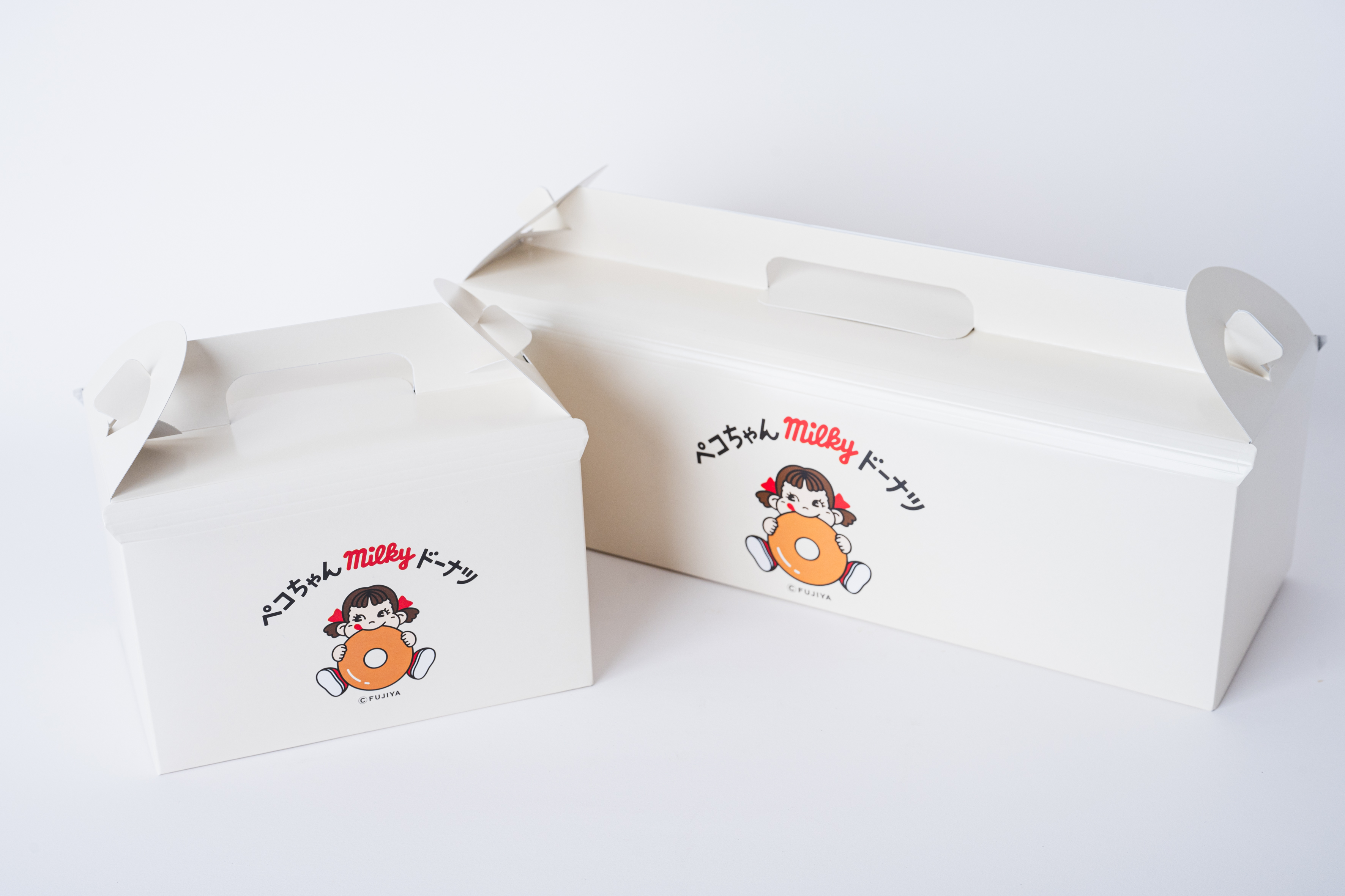 まとめ買いすると無料の箱に入れてくれるサービスも。「ペコちゃん」がドーナツを食べているイラストがかわいく、手土産に持っていきたくなります!