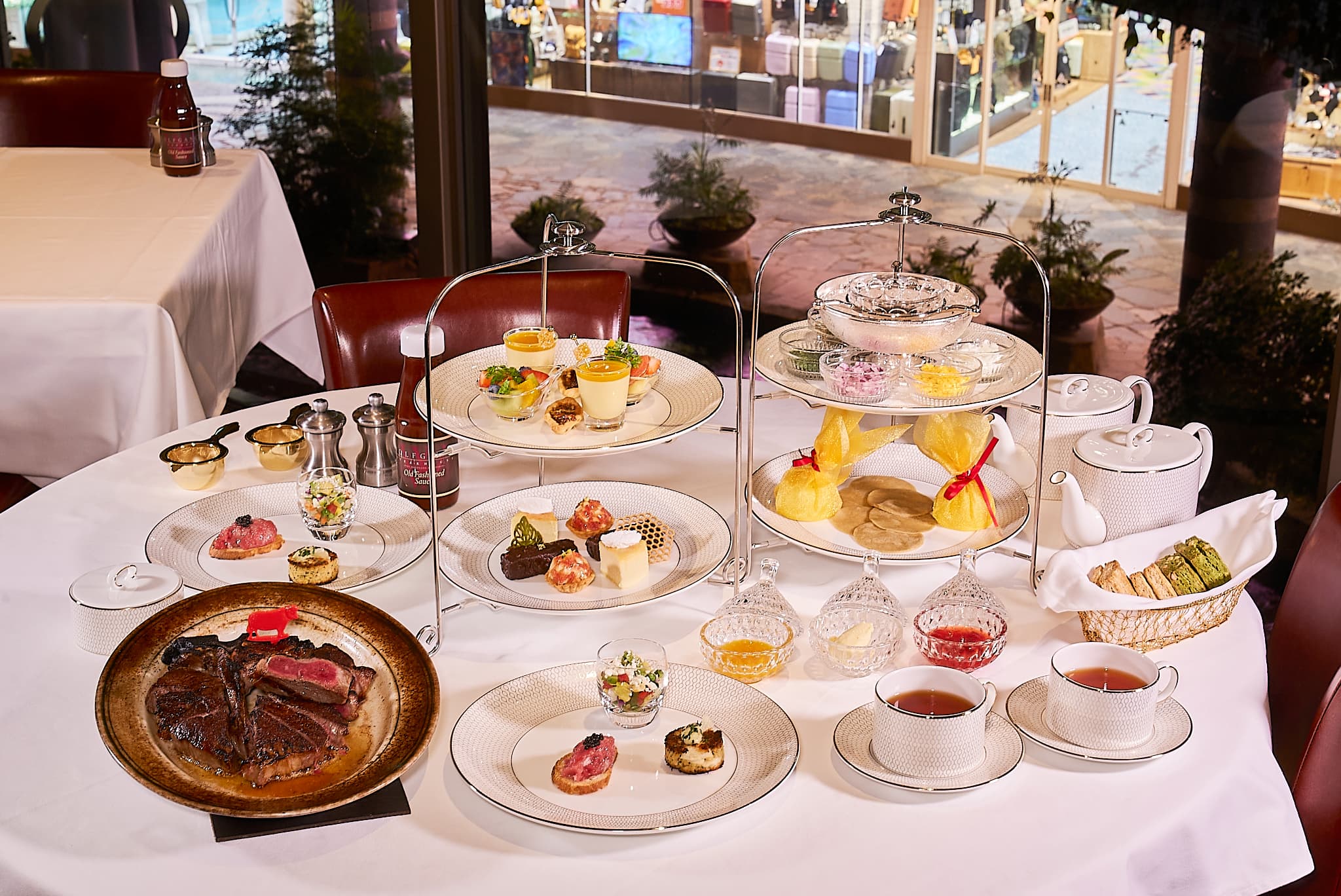 「夜景の肉食ハイティー」は、夕食を兼ねて紅茶やお酒を楽しむ英国発祥の“ハイティー”をベースに、ウルフギャングならではのステーキと福岡の夜景を融合させた新しいスタイル。クラブケーキやキャビア添えのクロスティーニなどを盛り込んだセイボリープレート、2段のケーキスタンドに並ぶスイーツ、そしてメインのステーキがセットになった豪華な内容です。
